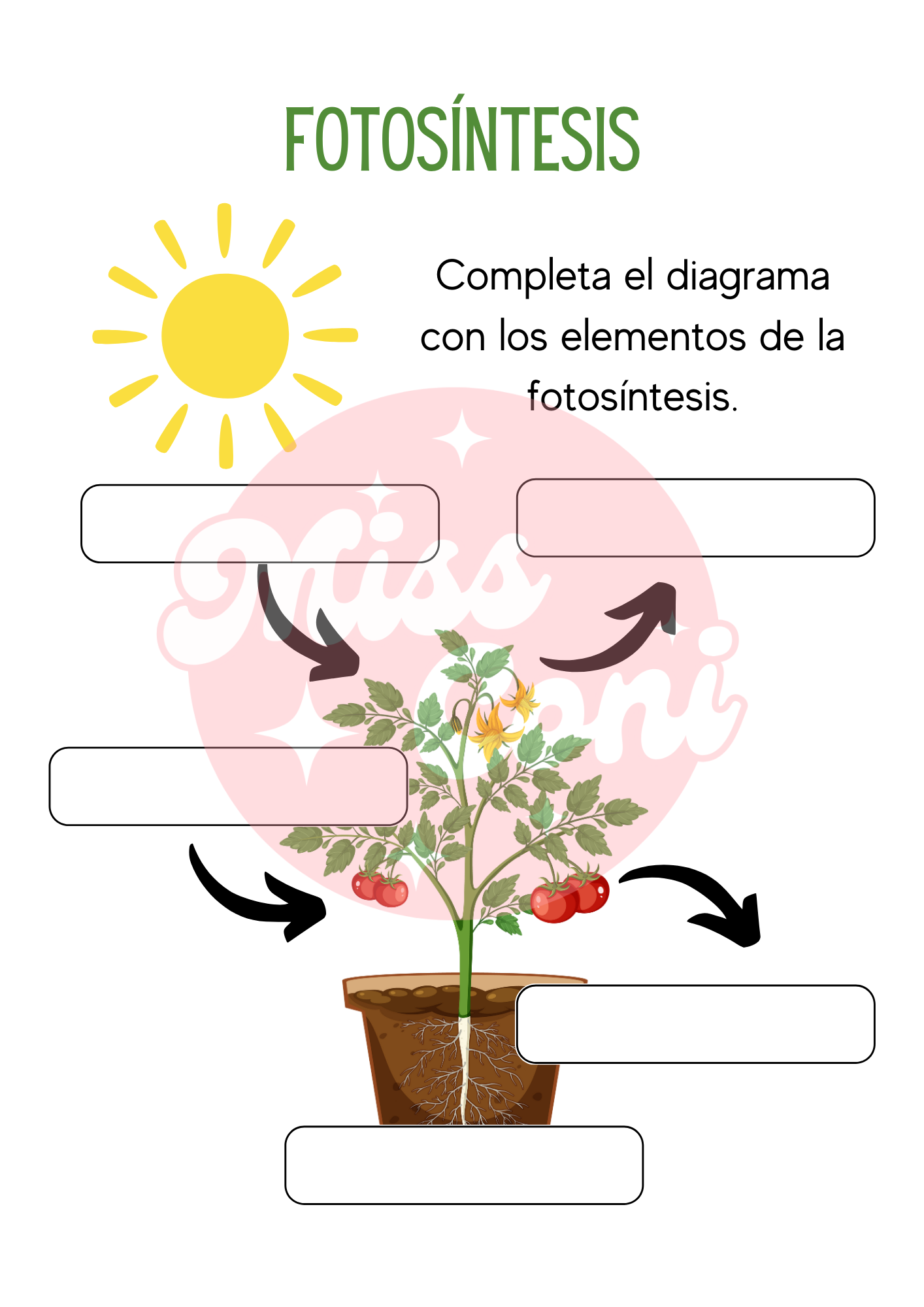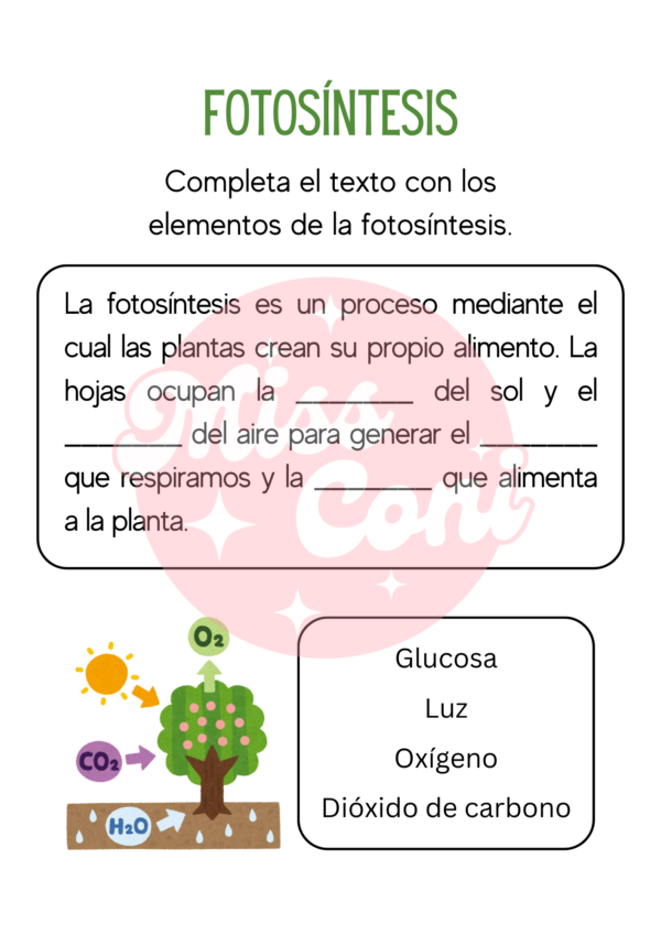 Actividad de ciencias naturales en donde los estudiantes tienen que completar un texto con la descripción de fotosíntesis y rellenar un diagrama con los elementos de este proceso.