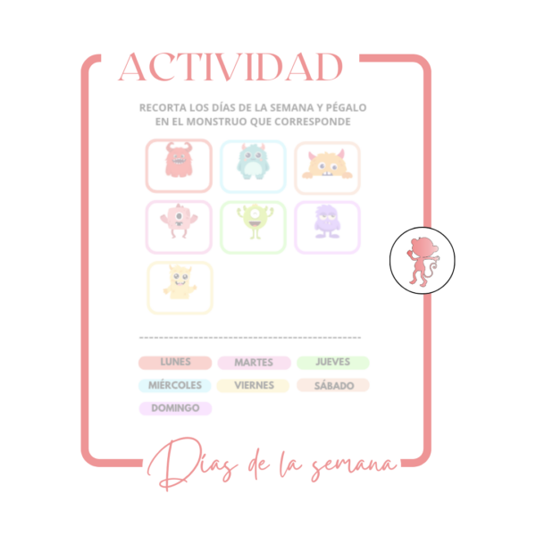 Esta actividad permite a los estudiantes aprender los días de la semana de una manera divertida y visual. Los niños deben recortar los nombres de los días y pegarlos junto a un monstruo de color asignado a cada día. La combinación de colores y figuras facilita la asociación y recordación de los días, mientras que el recorte y pegado refuerzan la motricidad fina. Es una actividad interactiva que promueve el aprendizaje de manera lúdica y creativa, ideal para reforzar la secuenciación y el reconocimiento de los días de la semana.