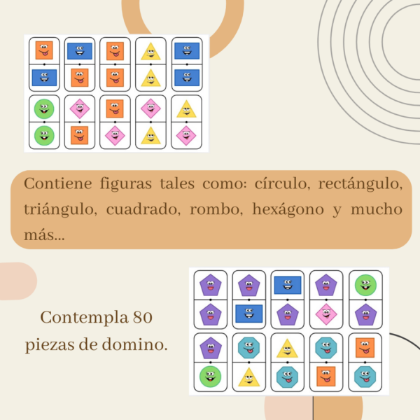 - Fichas de dominó: Un conjunto completo de fichas con ilustraciones claras y coloridas de diversas figuras geométricas.
