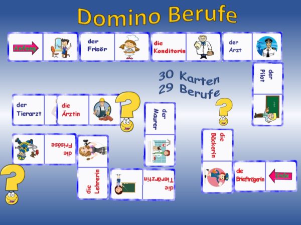 Dominó Profesiones para la asignatura de Alemán. Especial para la ejercitación del vocabulario en formal grupal o individual. Está en formato PDF, imprimible y para facilitar la manipulación de los estudiantes debería termolaminarse. Creación propia