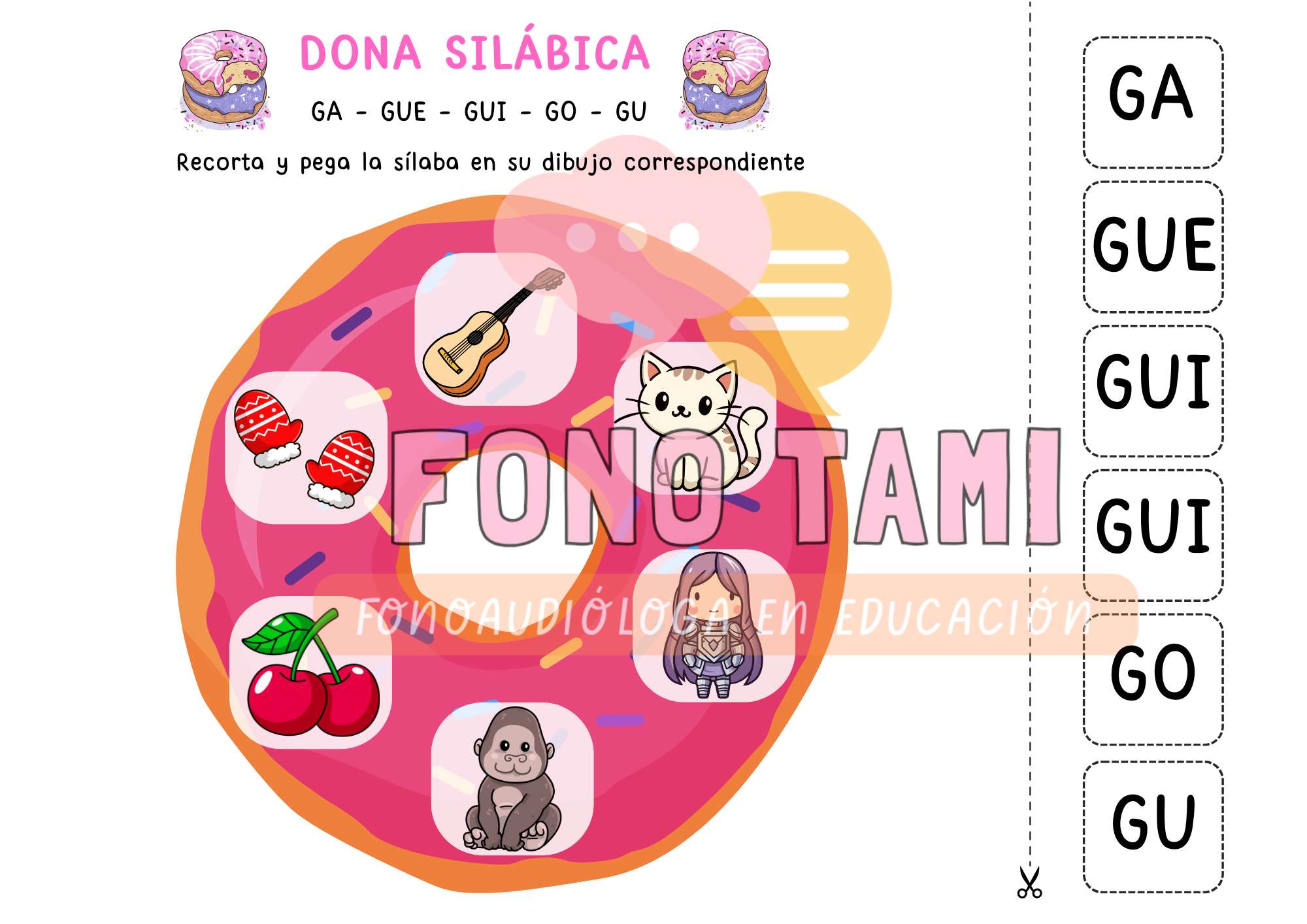 Los estudiantes deben recortar la sílaba e ir pegándola sobre la imagen que comienzan con la sílaba: GA-GUE-GUI-GO-GU.