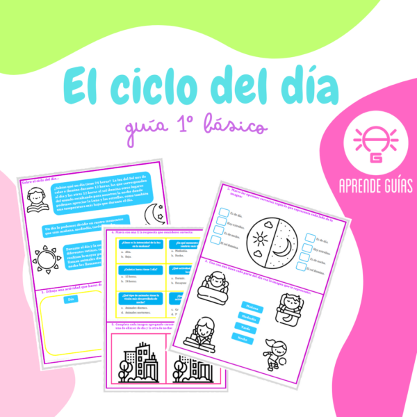 Guía de aprendizaje de ciencias naturales con 6 actividades desarrollada para niños y niñas que cursan 1° básico en base a los objetivos de aprendizaje del MINEDUC en los planes y programas. OA 11 “Describir y registrar el ciclo diario y diferencias entre el día y la noche , a partir de la observación del sol, la luna, las estrellas y la luminosidad del cielo, entre otras, y sus efectos en los seres vivos y el ambiente”