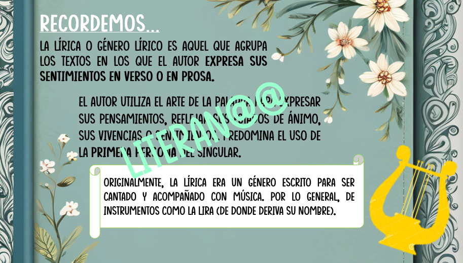 Este es un PPT editable, sobre los principales elementos del género lírico (hablante lírico, temple de ánimo, motivo lírico, actitud lírica, figuras literarias). Incluye extractos de distintos poemas para ejemplificar.