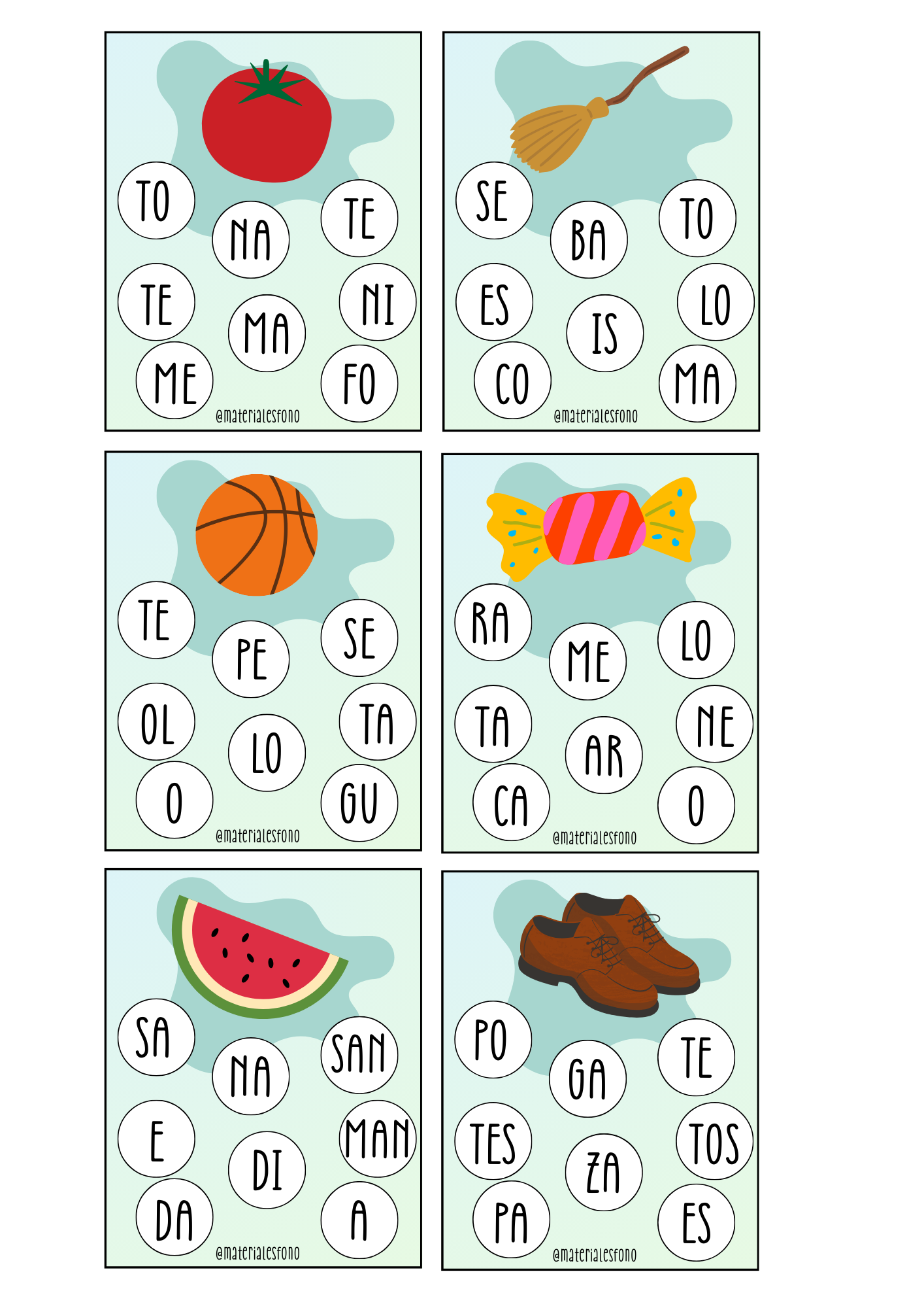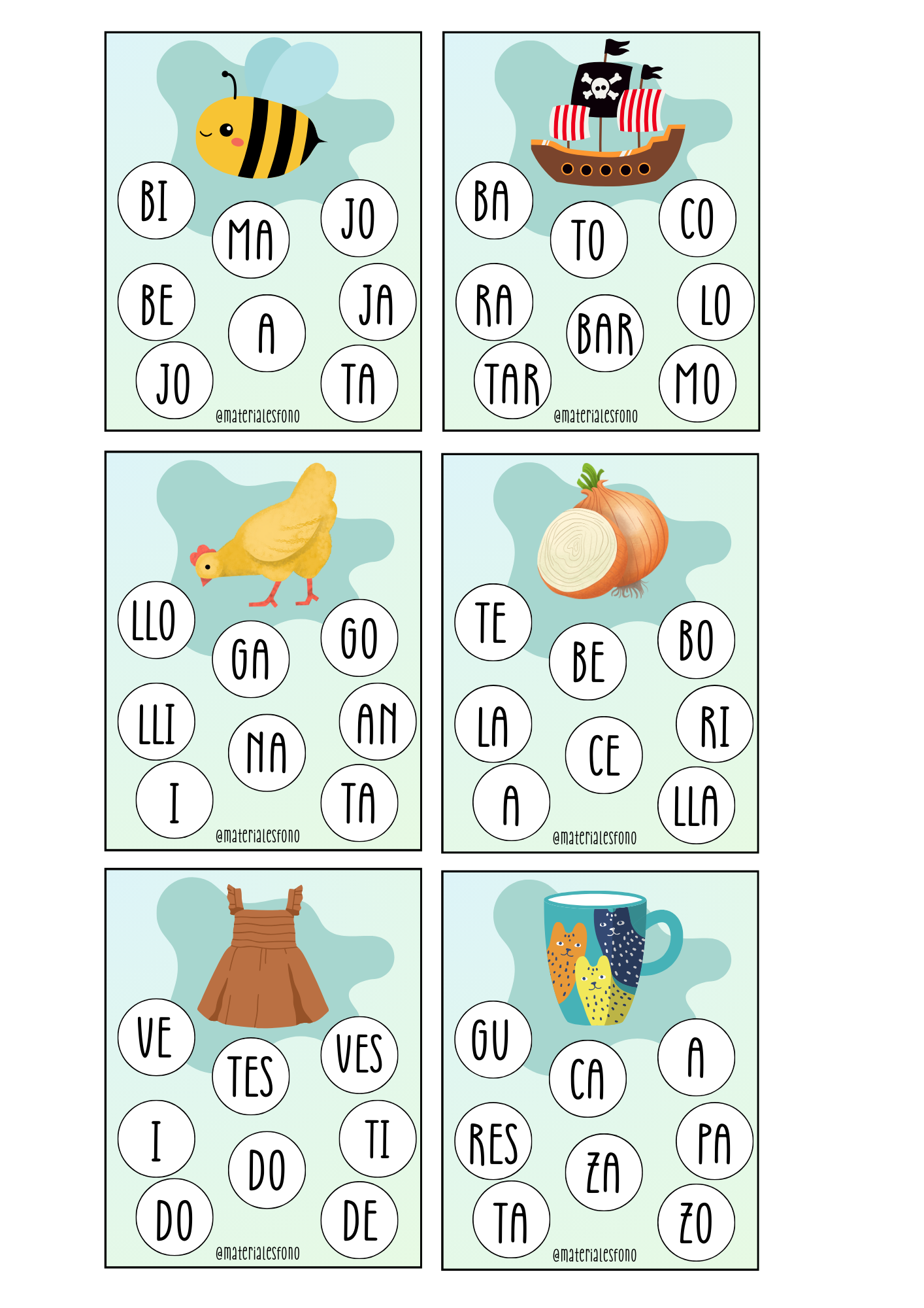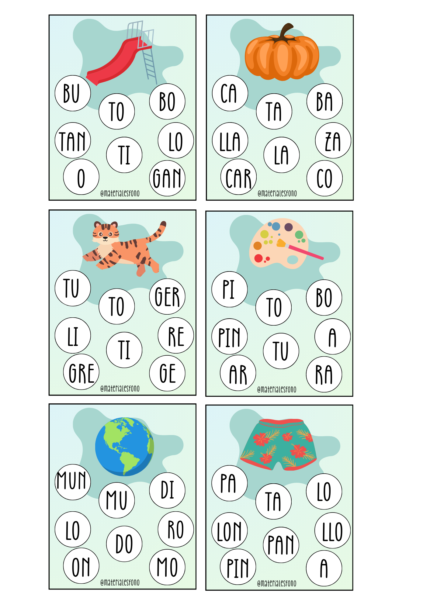 Contiene 18 tarjetas con una imagen central y varias opciones de sílabas para marcar la/las correctas.