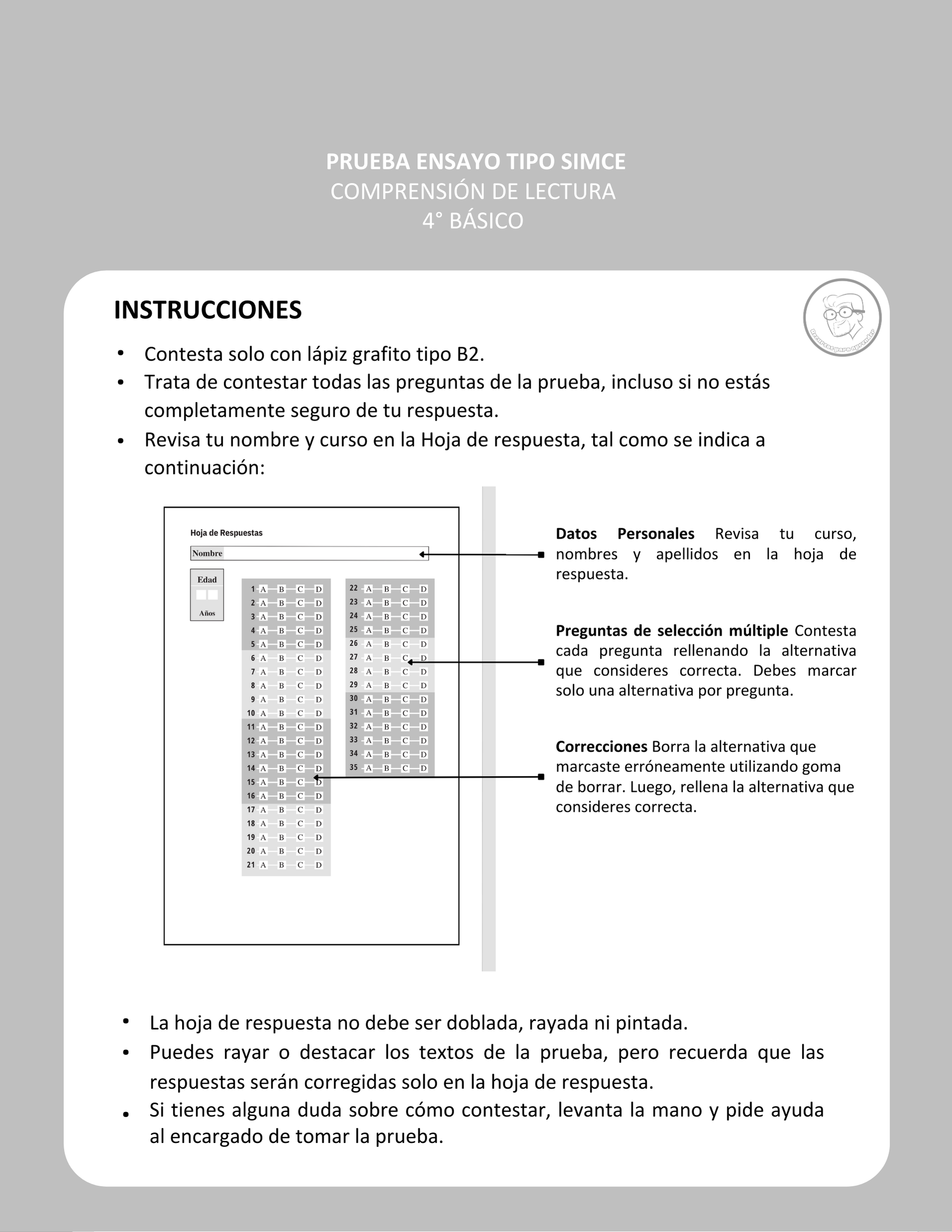 Ensayo SIMCE de Lenguaje para un cuarto básico, en formato simil al oficial.