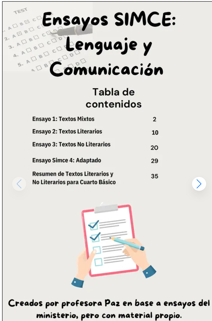 Este documento contiene una serie de 4 ensayos y actividades diseñadas para estudiantes de cuarto básico, enfocados en la evaluación SIMCE (Sistema de Medición de la Calidad de la Educación) en el área de Lenguaje y Comunicación. Los ensayos han sido creados por mi y están basados en el material del ministerio, adaptados con contenido propio para fomentar el aprendizaje integral de los estudiantes.