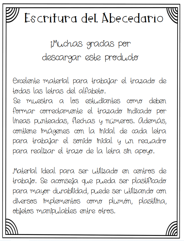 Excelente material para trabajar el trazado de todas las letras del alfabeto. Se muestra a los estudiantes cómo deben formar correctamente el trazado indicado por líneas punteadas, flechas y números. Además, contiene imágenes con la inicial de cada letra para trabajar el sonido inicial y un recuadro para realizar el trazo de la letra sin apoyo.