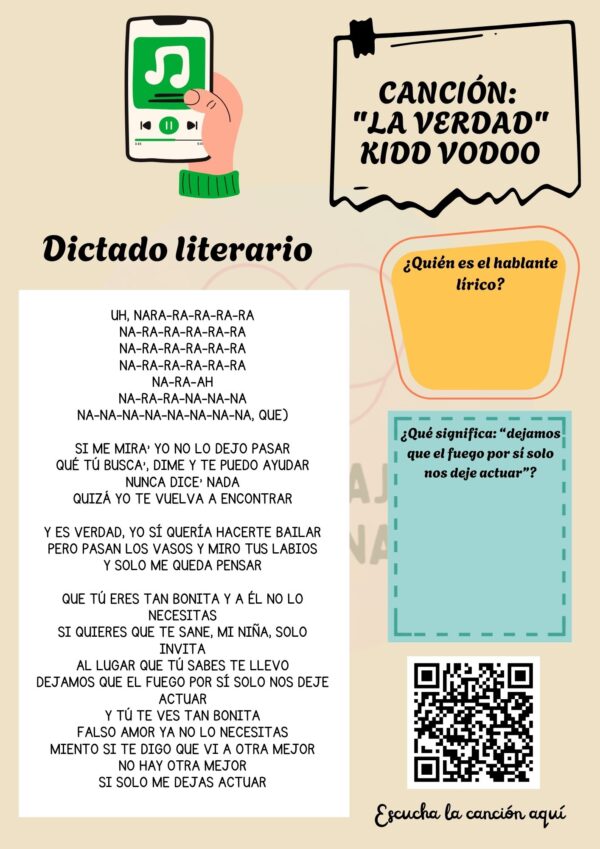 Estimada colega, te comparto estas fichas de dictado literario en donde podrás trabajar diversas canciones para introducir a tus estudiantes de segundo ciclo y enseñanza media a la materia de Género lírico.