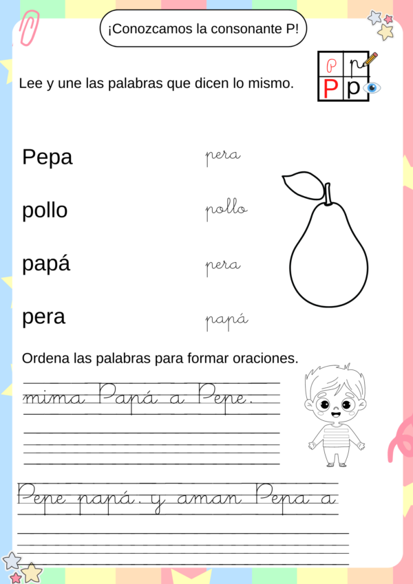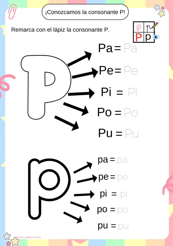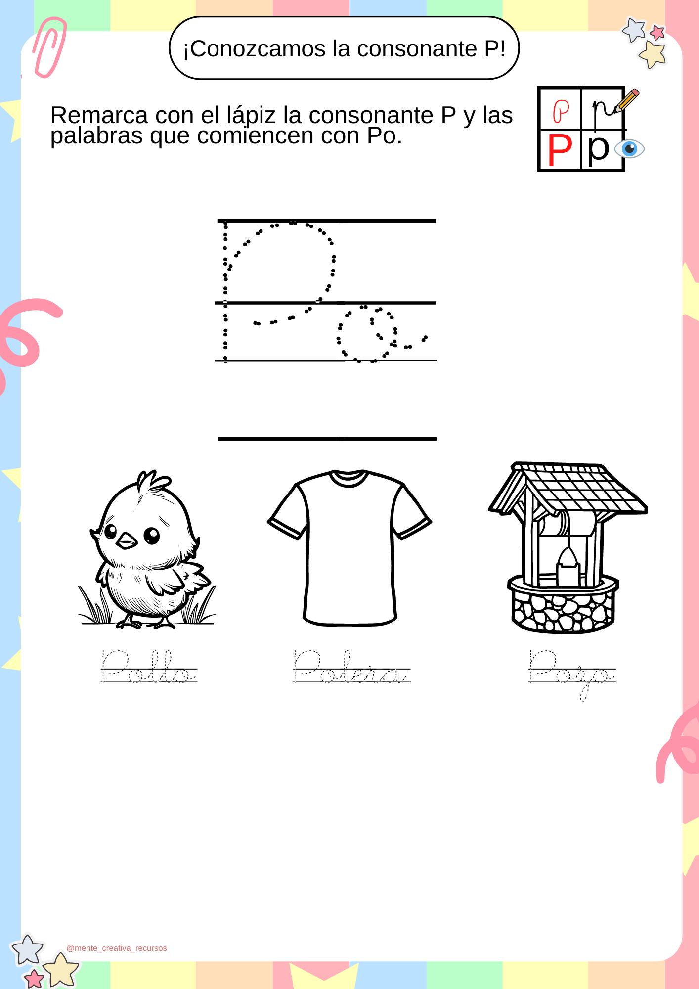 Fichas de la consonante P, para trabajar tanto en primero como en segundo básico. Con muchas actividades variadas, desde caligrafía hasta formar sílabas y oraciones. Contiene: