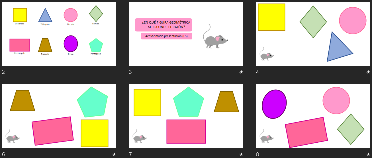 En esta actividad podrás conocer y repasar las figuras geométricas más básicas y también podrán realizar un juego en donde un pequeño ratón se esconderá detrás de alguna figura. ¡Deberán observar muy bien para decir en cuál se escondió!