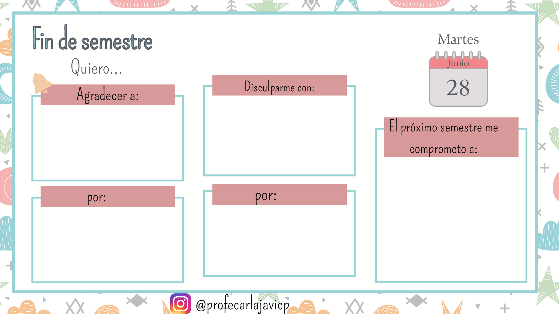 Hola profesores! les comparto estas plantillas para trabajar en este fin de semestre. Son sencillas, fáciles de usar y sirve para que tus estudiantes reflexionen sobre como se sintieron en cada clase y que esperan para el próximo semestre.