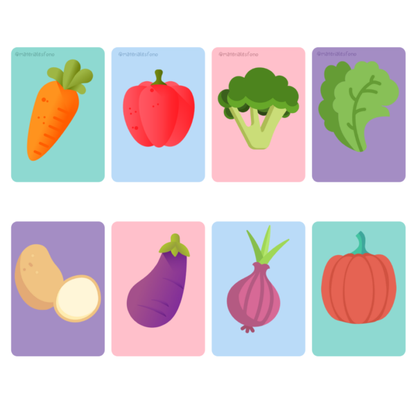 Las flashcards son tarjetas que permiten trabajar sobre múltiples objetivos: atención, vocabulario, lectura, escritura, categorías de palabras. Estas tarjetas contienen imágenes de frutas, verduras y postres. Algunas tienen la palabra escrita y otras no.