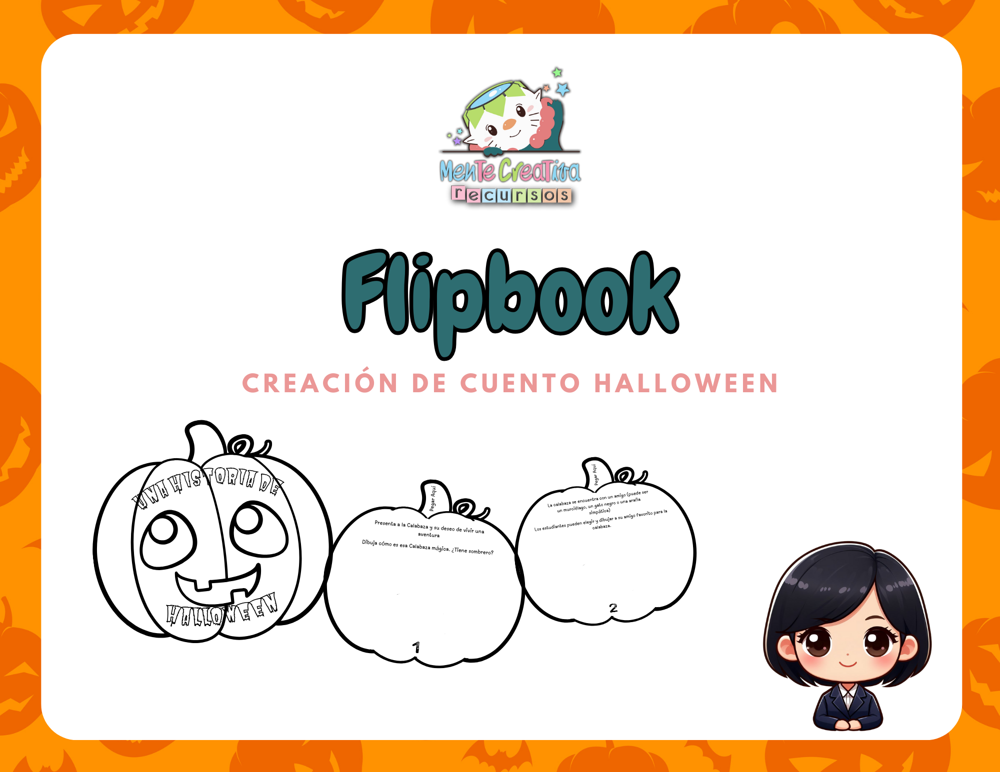 Este Flipbook de Halloween está diseñado para estimular la creatividad de los niños mientras se divierten. Ideal para actividades en el aula o en casa, este recurso educativo invita a los niños a crear su propia historia, dibujando una calabaza mágica y su compañero de aventuras. A través de este cuento interactivo, los pequeños explorarán un bosque encantado, se encontrarán con personajes como murciélagos o gatos negros, y podrán desarrollar sus habilidades artísticas y narrativas.