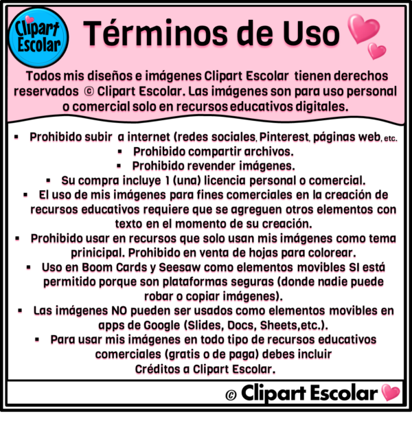 Todos mis diseños e imágenes Clipart Escolar tienen derechos reservados © Clipart Escolar. Las imágenes son para uso personal o comercial solo en recursos educativos digitales. Por favor lee los Términos de Uso en la descripción antes de comprar.