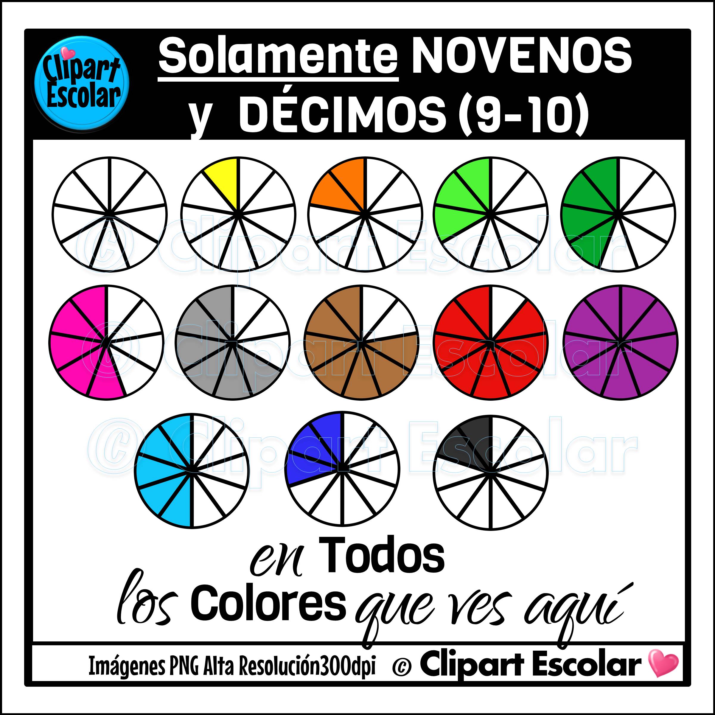 Clipart 230 Fracciones Figura Círculo novenos y décimos solamente (clipart) PNG en un arcoíris de colores. Imágenes incluyen color y blanco y negro perfectas para enseñar fracciones. También puedes crear posters a color muy lindos, hojas de trabajo de matemáticas, juegos de flashcards, juegos de memoria, bingo, y mucho más!