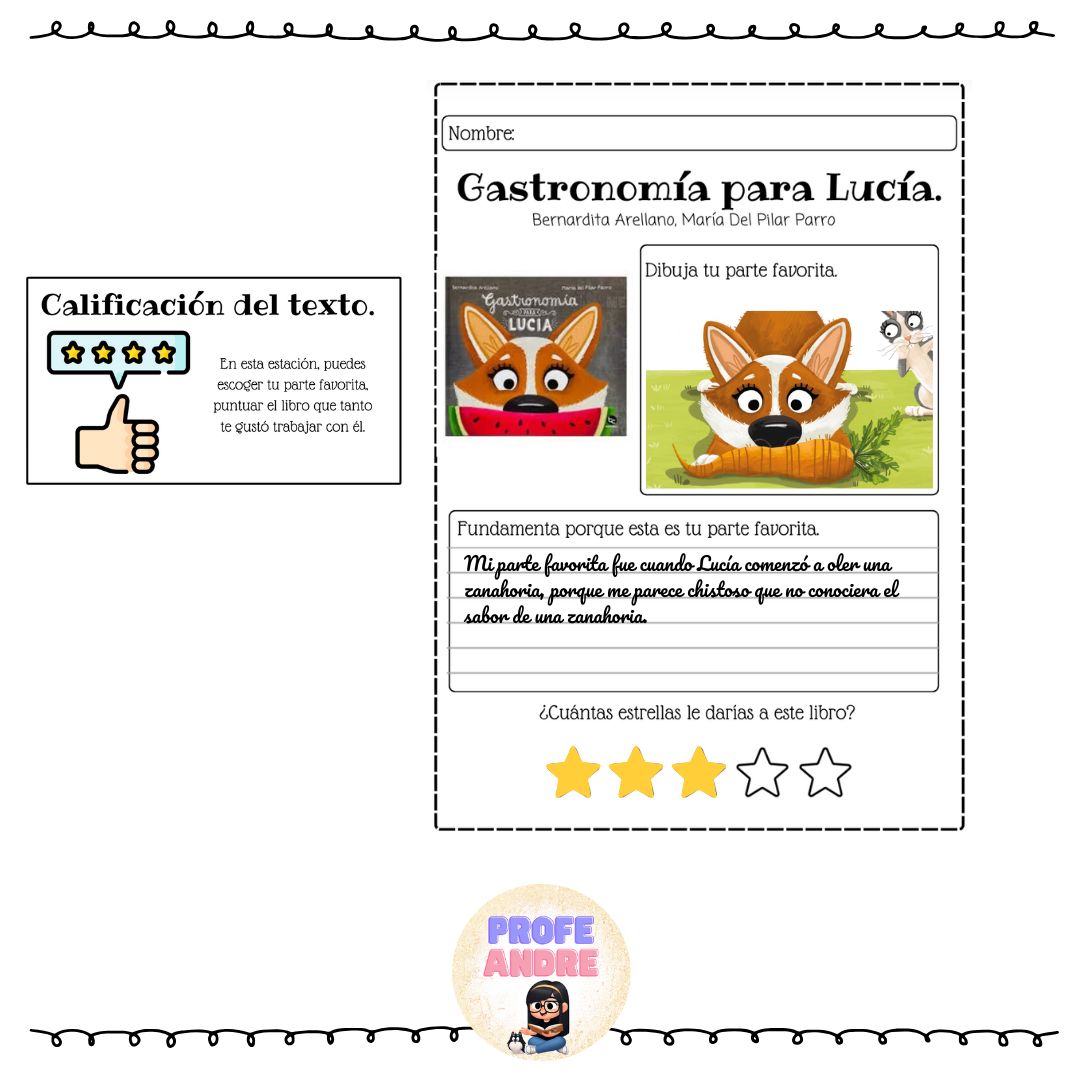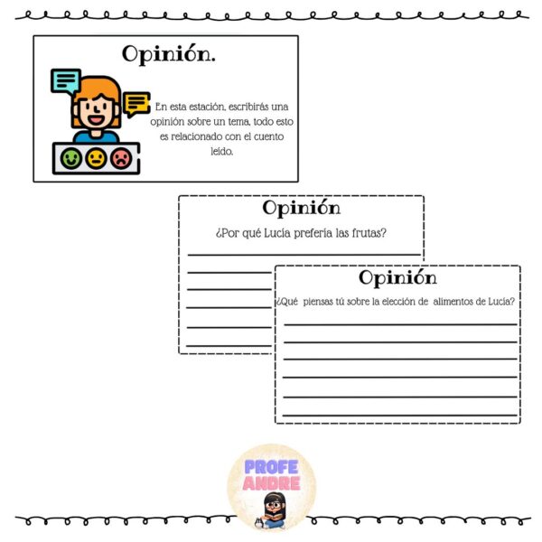 Podrás encontrar actividad de opinión, descripción de personajes, escritura de oraciones.