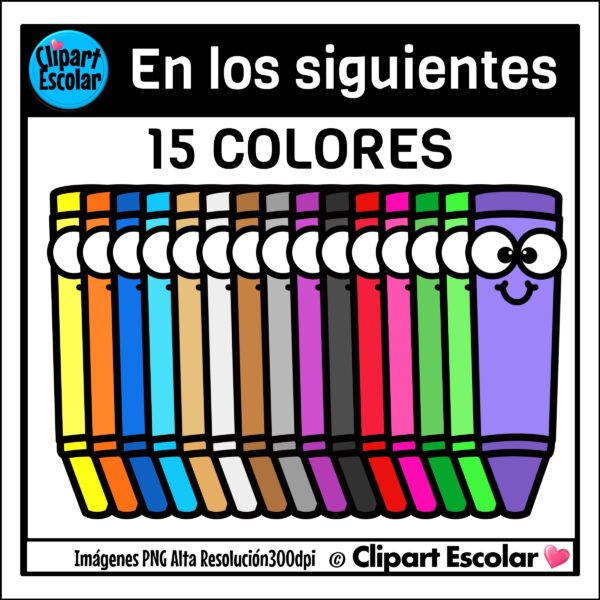 Cada crayón en los siguientes colores: amarillo, beige, azul, rojo, anaranjado, verde, morado, rosa, café, violeta, gris, negro, blanco, azul claro, verde claro y blanco/negro.