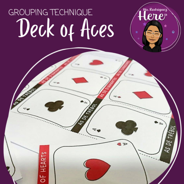 - Dos set de ases, uno en español y otro en inglés, cada uno con 16 tarjetas para crear grupos de hasta 4 estudiantes por equipo.