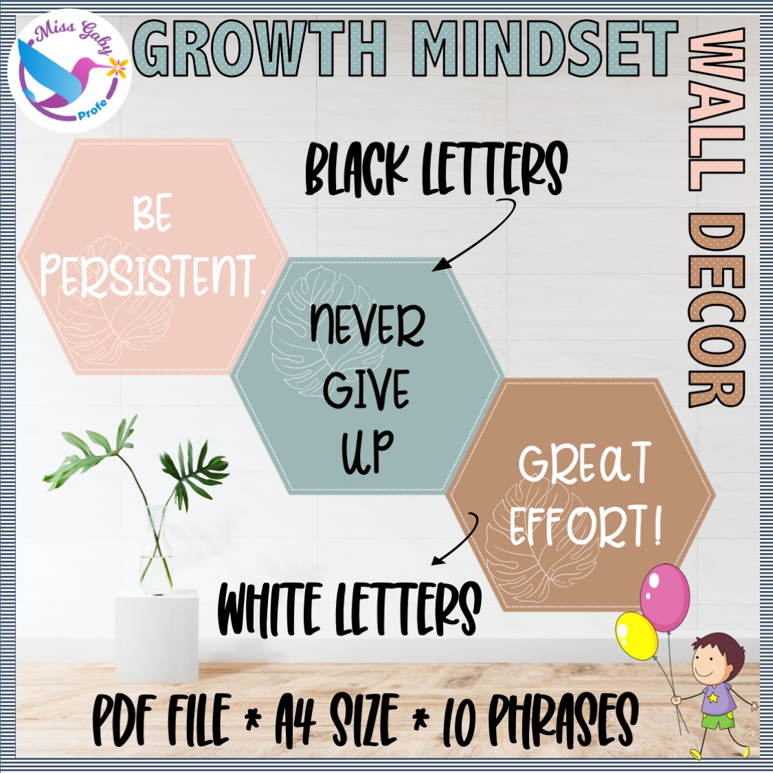 Decoración con frases de Growth Mindset para tu sala de inglés en tonos pasteles. Listo para imprimir, laminar e instalar.