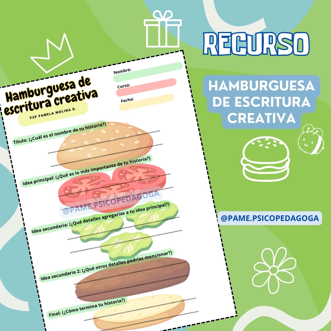 Este recurso es una buena idea para trabajar con estudiantes pequeños que se inician en la escritura. Pone en práctica la producción de textos de una manera lúdica y comprensible. Cada ingrediente de la hamburguesa representa una parte de la estructura de un texto donde hay una pequeña explicación de lo que deben escribir.