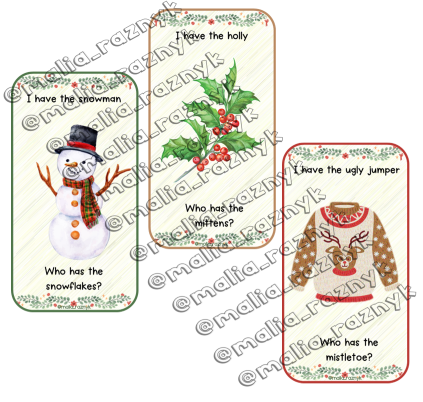 El jugador que empiece lee su tarjeta en voz alta, por ejemplo, “I have Santa Claus. Who has the Christmas tree?”