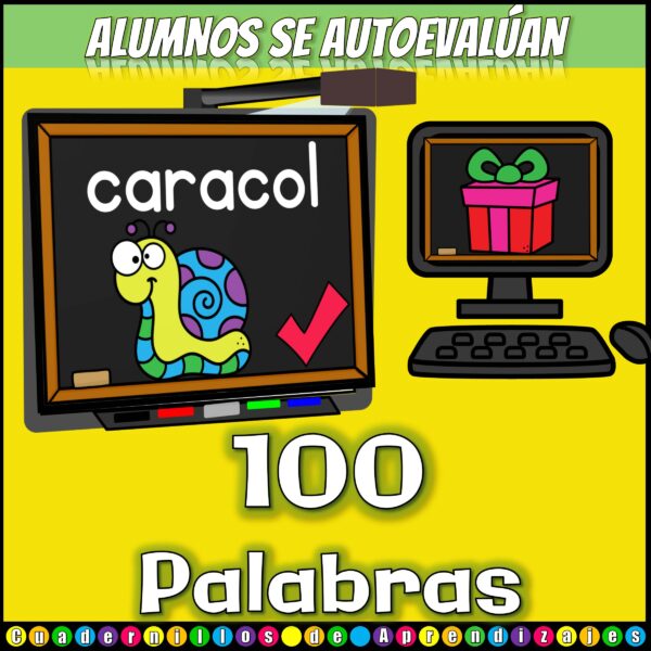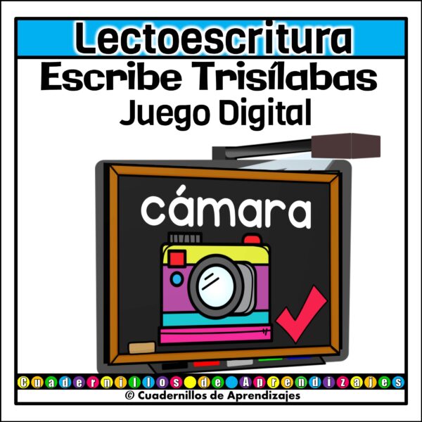 Juego Palabras 3 Sílabas (trisílabas) presentado con PowerPoint™ para practicar lectoescritura. En este juego, los peques observan imágenes de palabras trisílabas. Escriben la palabra y luego revisan lo escrito.