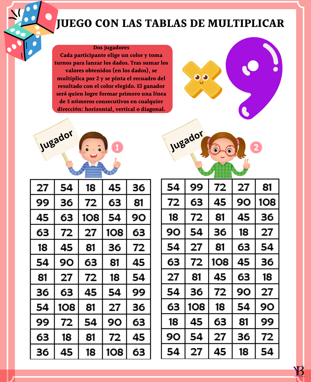los dados. Tras sumar los valores obtenidos (en los dados), se multiplica por ejemplo x2 y se pinta el recuadro del