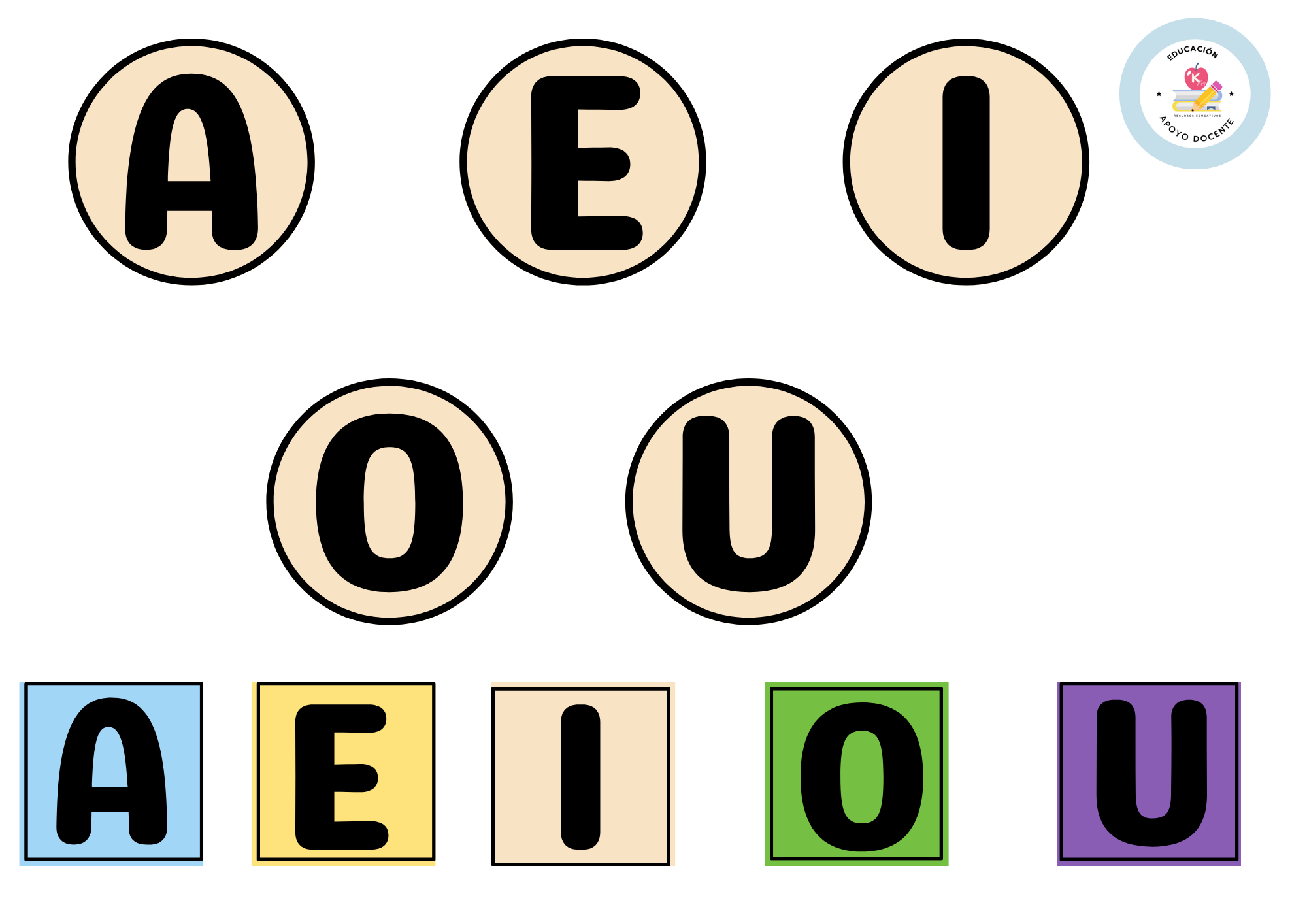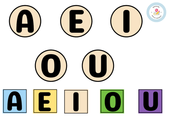 e. 2 plantillas recortables con vocales en imprenta mayúscula y minúscula. Plastificar y pegan en pinza de ropa para practicar la identificación de sonido inicial vocálico en los círculos.