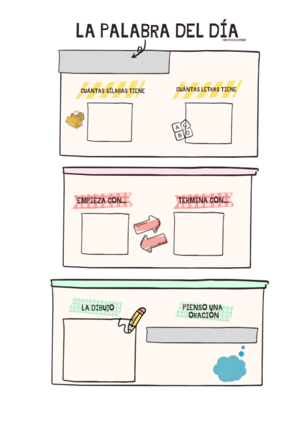 “La palabra del día” es una planilla para que cada niño/a escriba o pegue una palabra por día (que puede ser elegida por ellos mismos o por el docente). Luego analizamos cuántas sílabas y letras tiene, cuáles son las letras inicial y final, creamos una oración y dibujamos la palabra. Se puede imprimir en un formato más grande para usarla entre todos en el pizarrón.