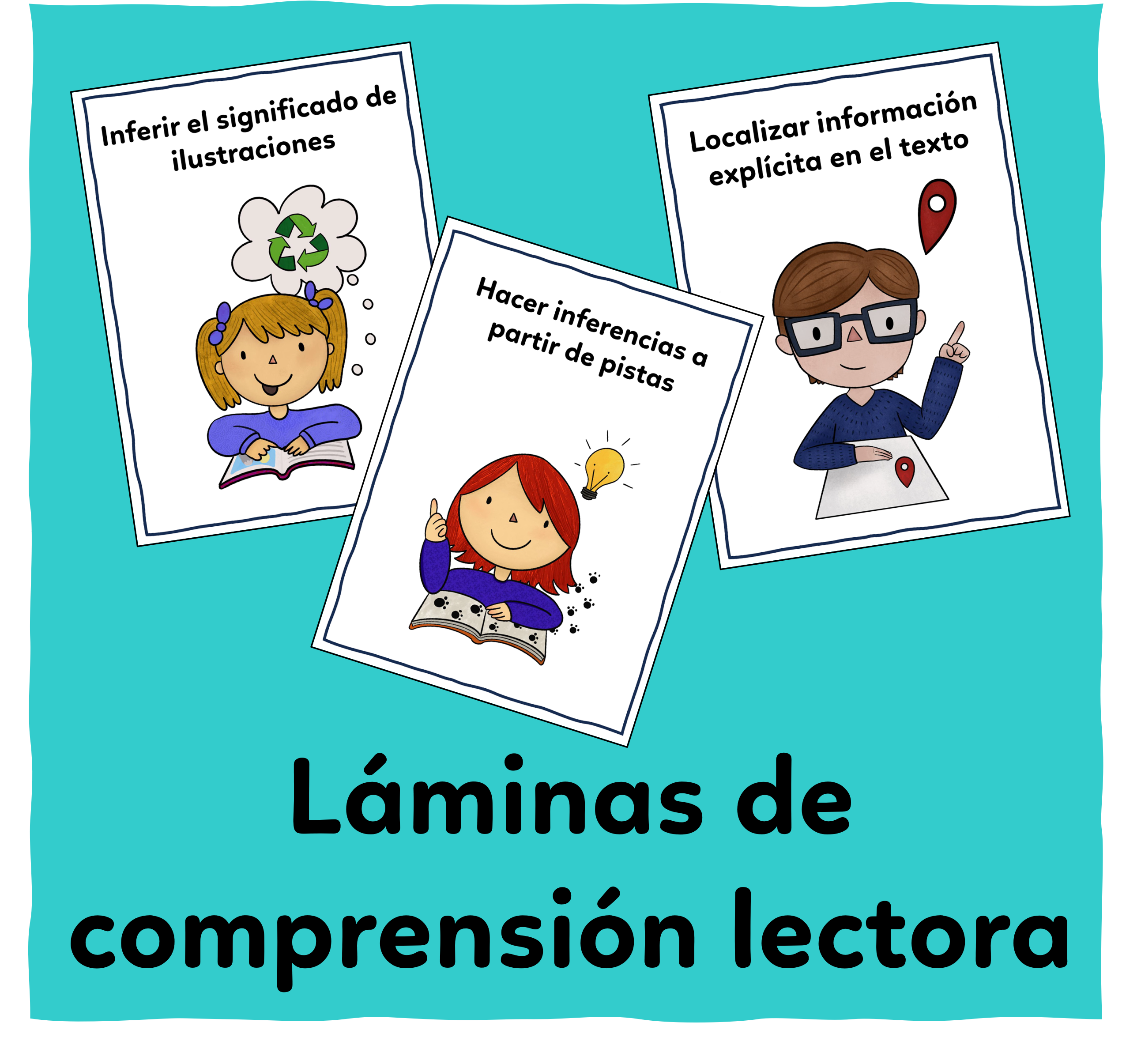 El PDF contiene 8 láminas que representan distintas estrategias de comprensión lectora, todas ilustradas con imágenes de niños y niñas aplicando las estrategias. Las estrategias son las siguientes: