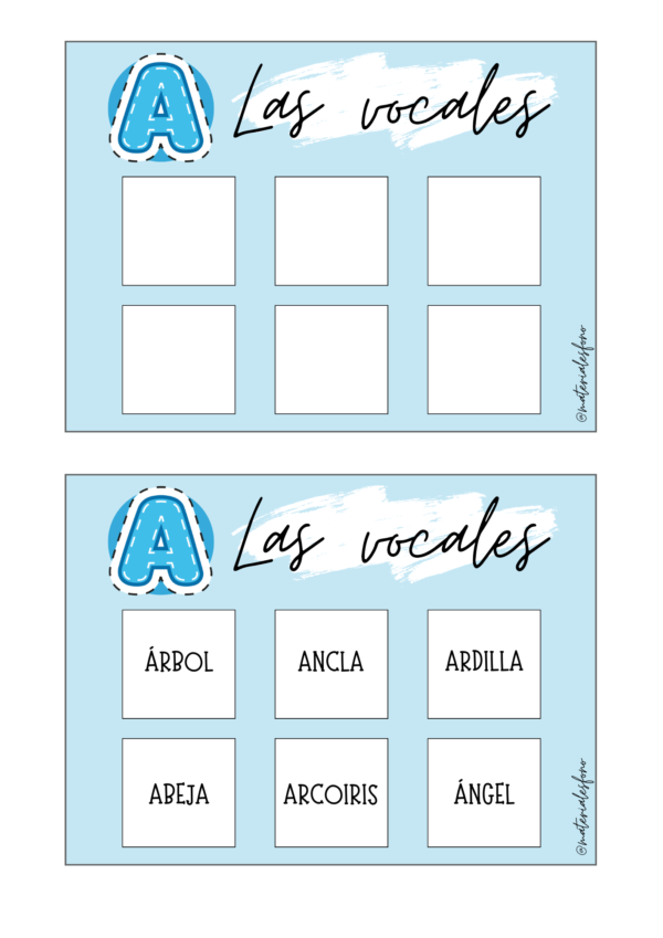 • 5 tarjetas con espacios para colocar las imágenes (una por cada vocal)