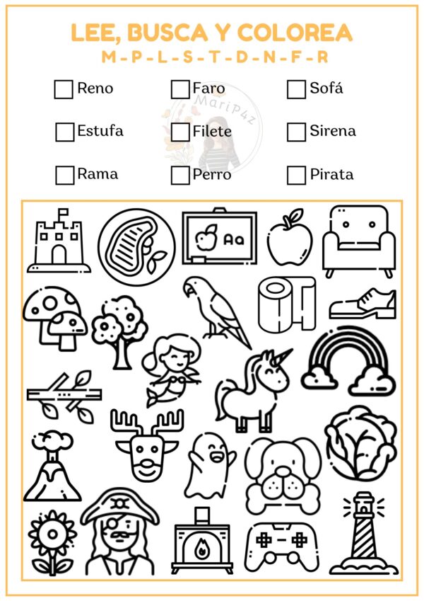 El siguiente recurso consiste en leer cada palabra, buscar el dibujo correspondiente y colorearlo.