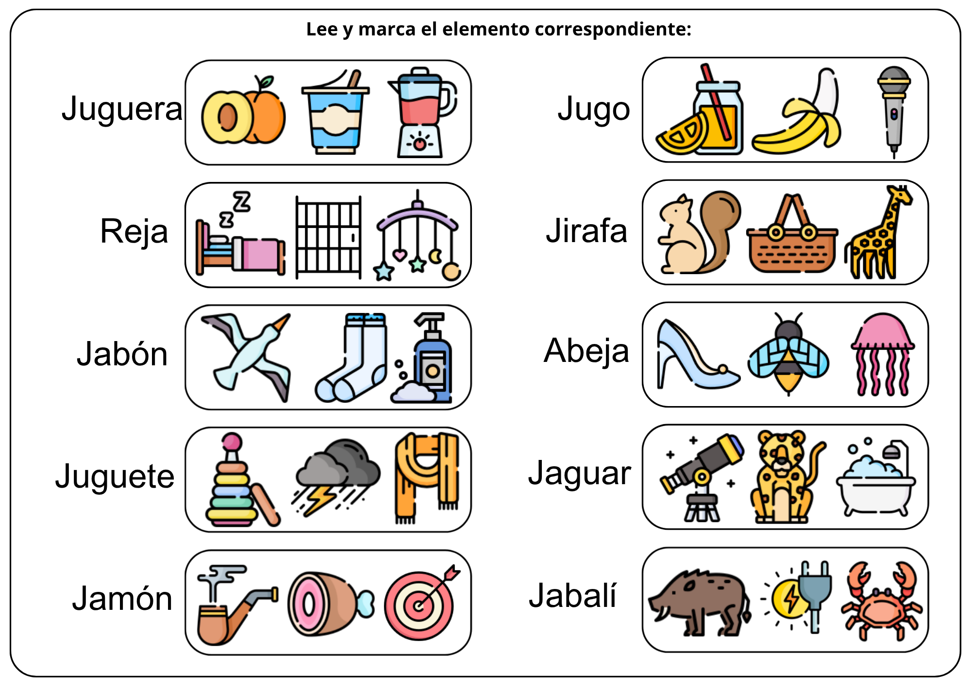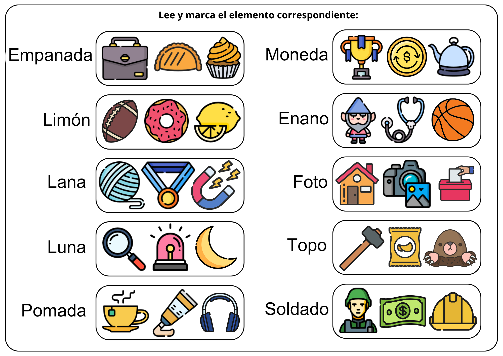 El siguiente recurso consiste en leer cada palabra y marcar el dibujo que corresponda.