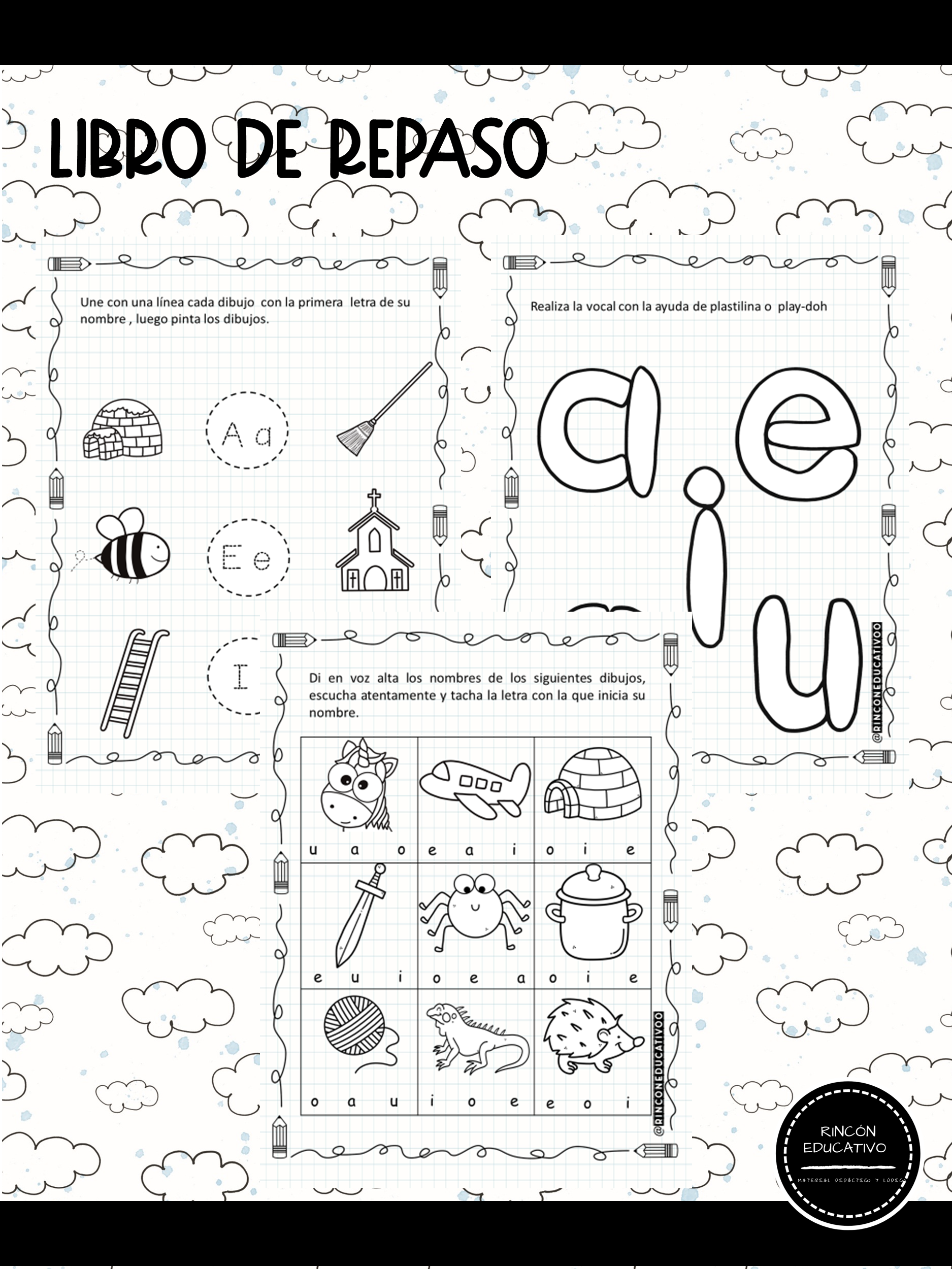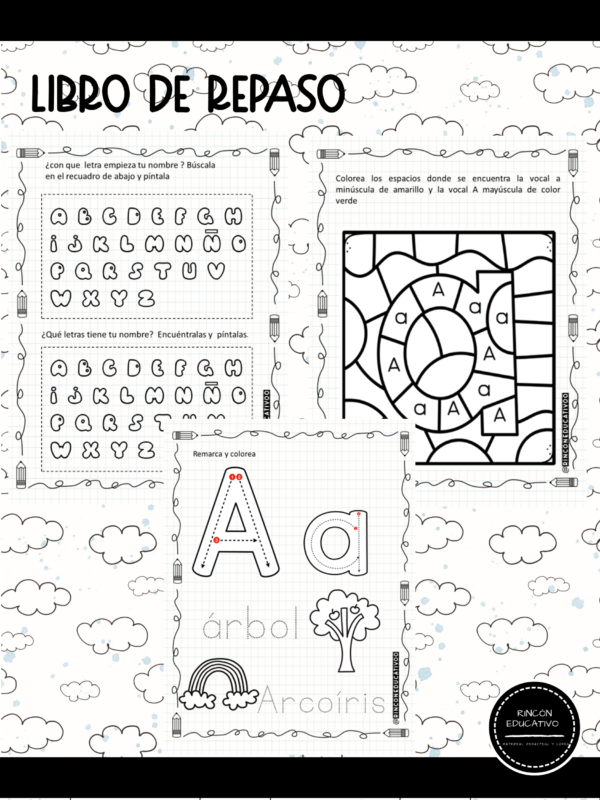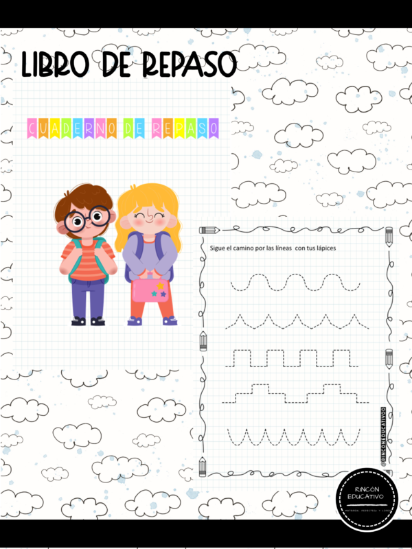 contiene 52 páginas para trabajar, grafomotricidad, vocales, trazo, sonido inicial, conteo números del 1 al 20, entre otros