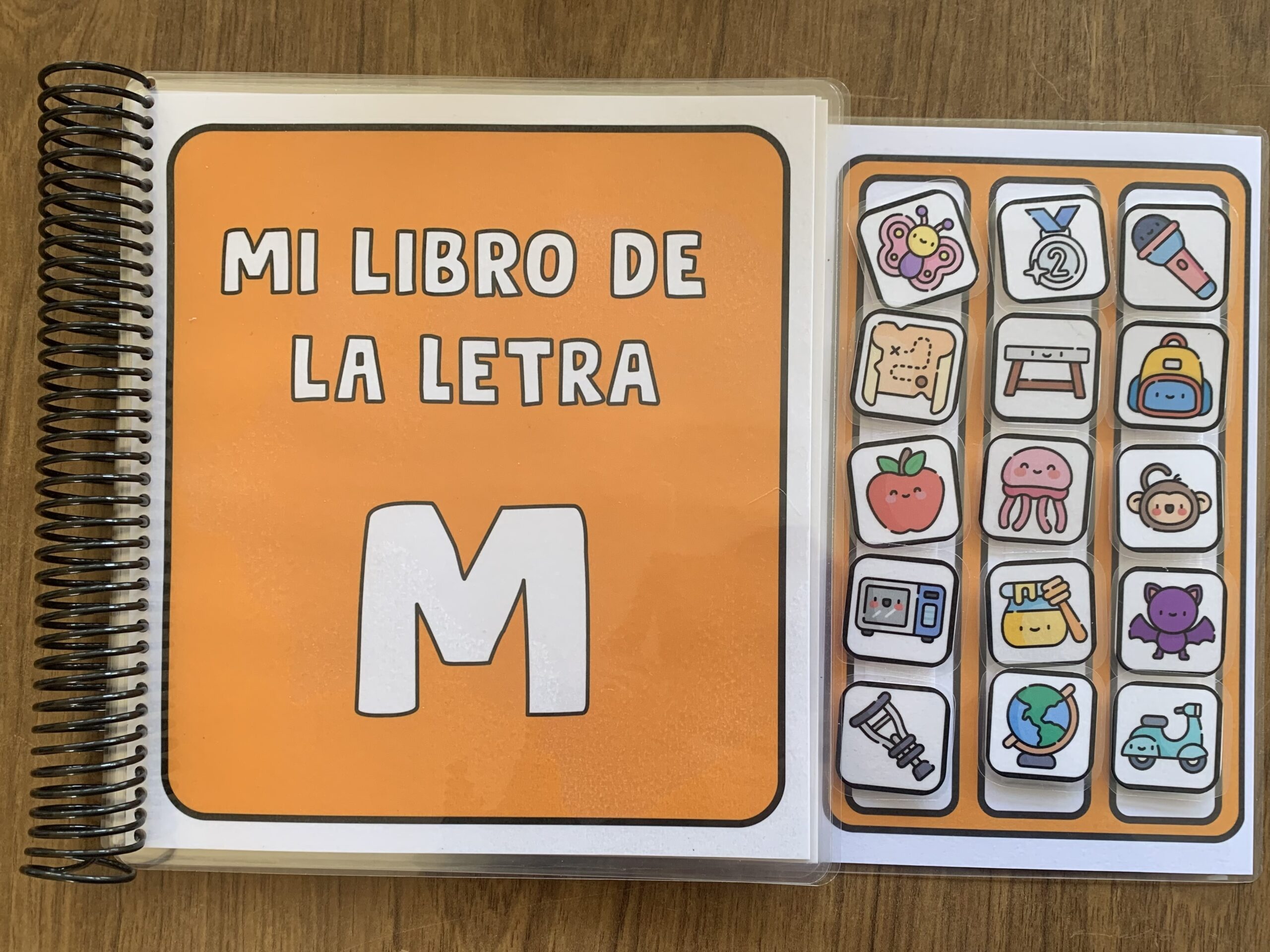 Libro manipulativo, de la consonante M, con este libro tu estudiante puede manipular las imágenes y clasificarlas según la sílaba con la que comienza.