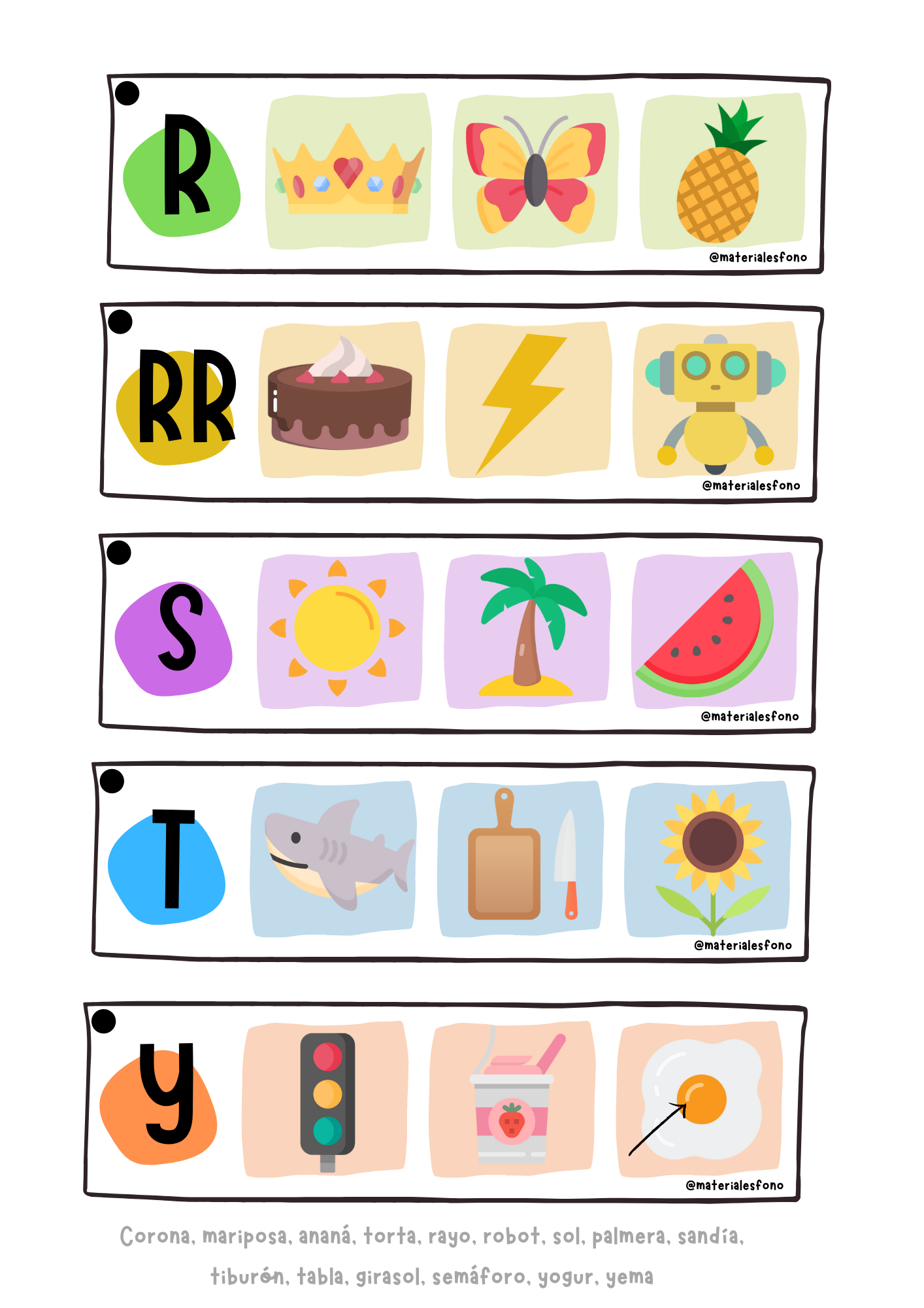 - 15 fichas con un fonema (letra) determinado, y 3 opciones para elegir el intruso (aquel que no comienza con dicho fonema)