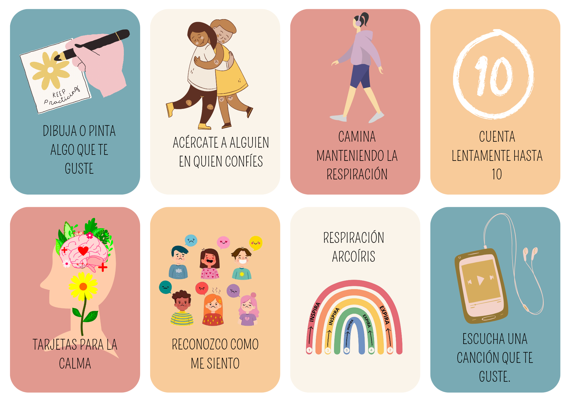 Tarjetas para trabajar en caso que necesitemos volver a la calma con alguno de nuestro estudiantes. Pueden usarse como tarjetas o juntarlas todas en un llavero y tenerlas a mano.