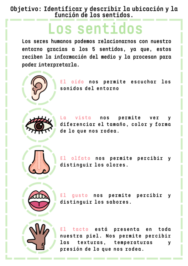 La siguiente guía tiene como finalidad trabajar el OA 06 de 1° básico, en la asignatura de Ciencias. Primeramente, se definen los sentidos y cada uno de estos, para luego realizar actividades para colorear y dibujar.