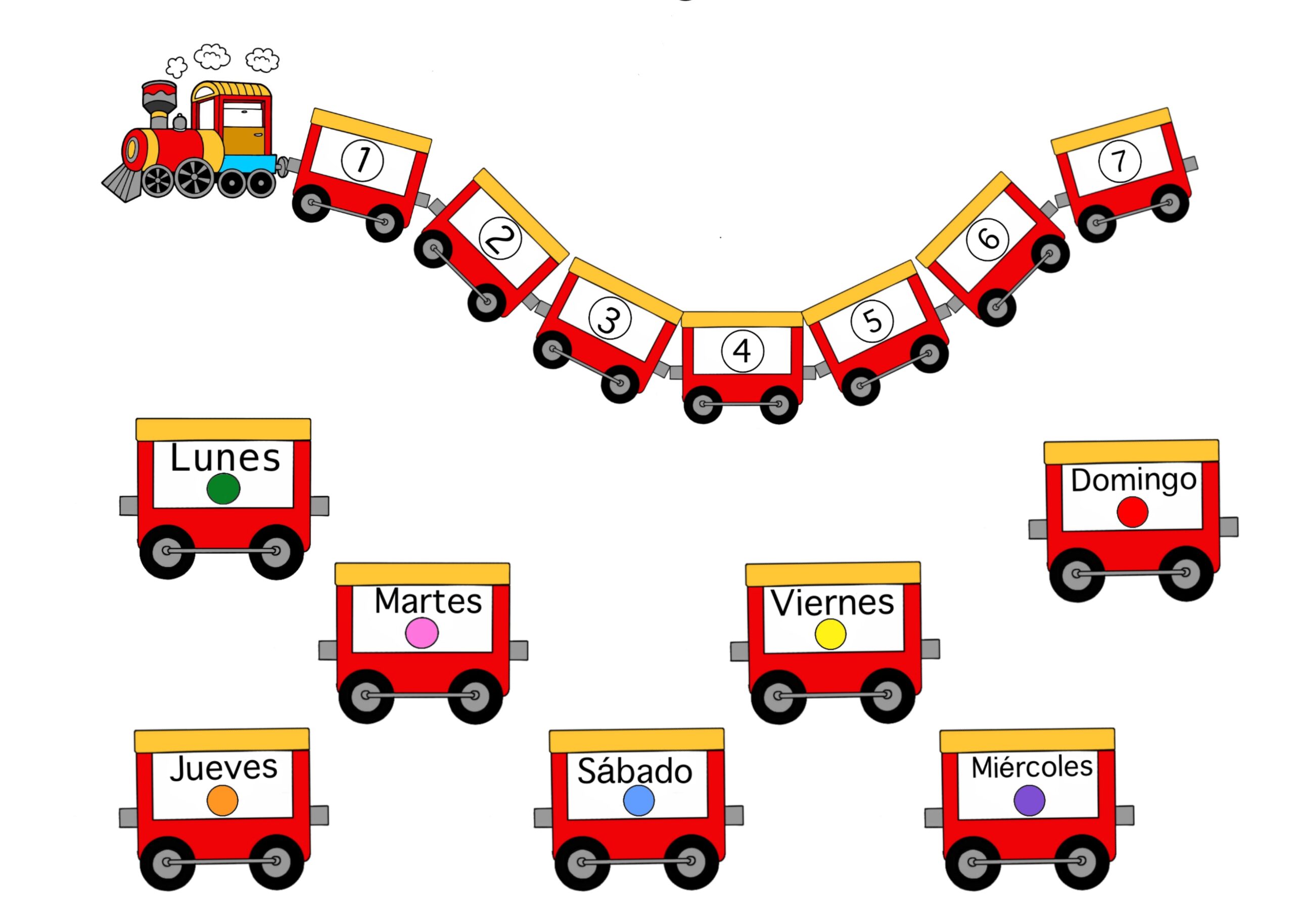 Tren con los días de la semana. Puedes usarlo en tus guías o pruebas. Ideal para niños que aún no saben leer y necesitan clave de color.