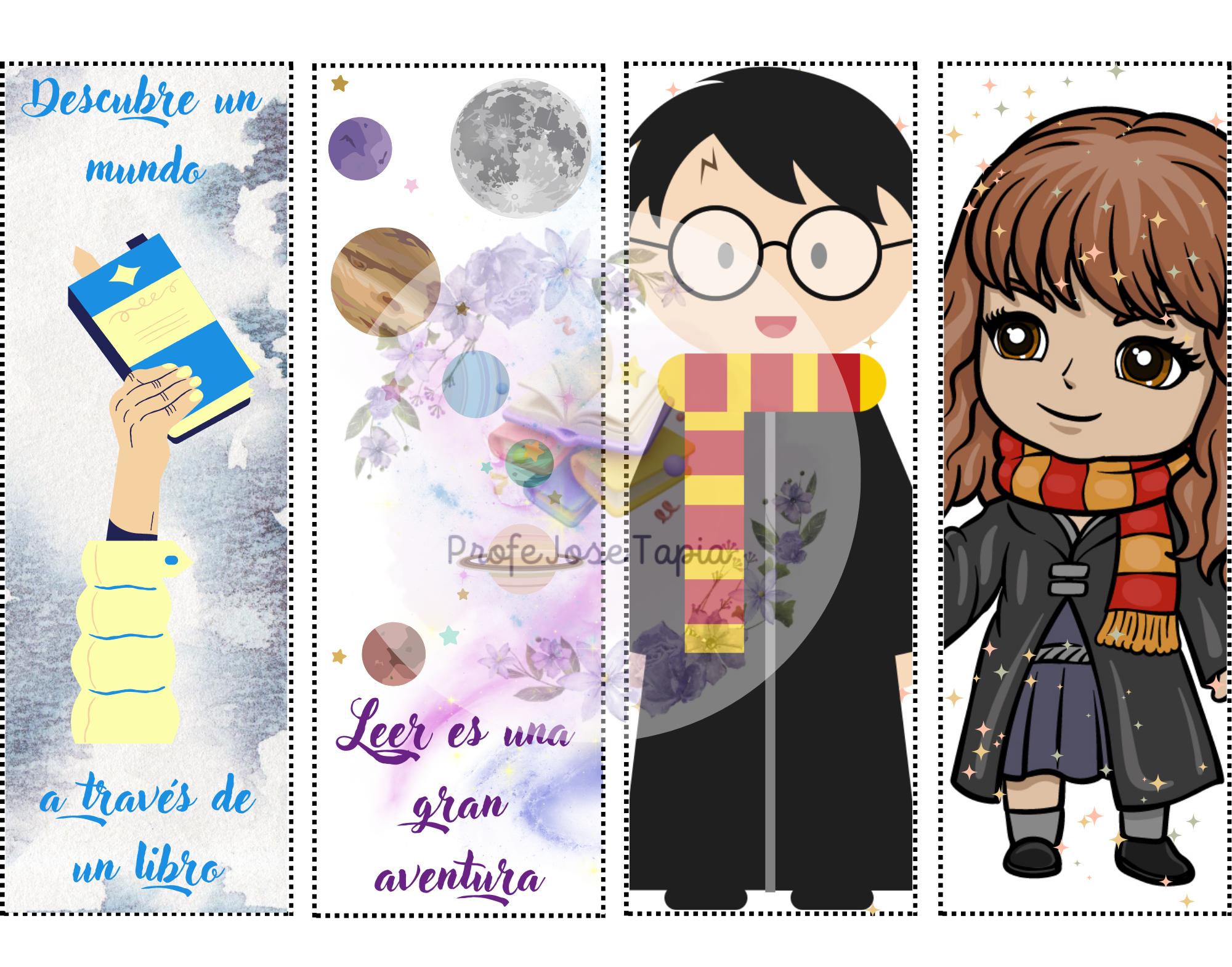 Dos Marcadores de páginas doble cara con frases motivadoras para la lectura y dos con personajes de Harry Potter, puedes usar este recurso como complemento para tus lecturas domiciliarias, clubes de lectura, etc.