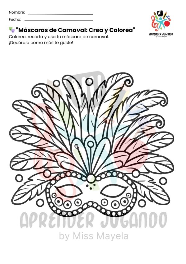 Este recurso educativo gratuito incluye cinco diseños de máscaras listas para colorear y decorar, permitiendo que los niños exploren el arte, desarrollen su motricidad fina y se sumerjan en la magia del carnaval.