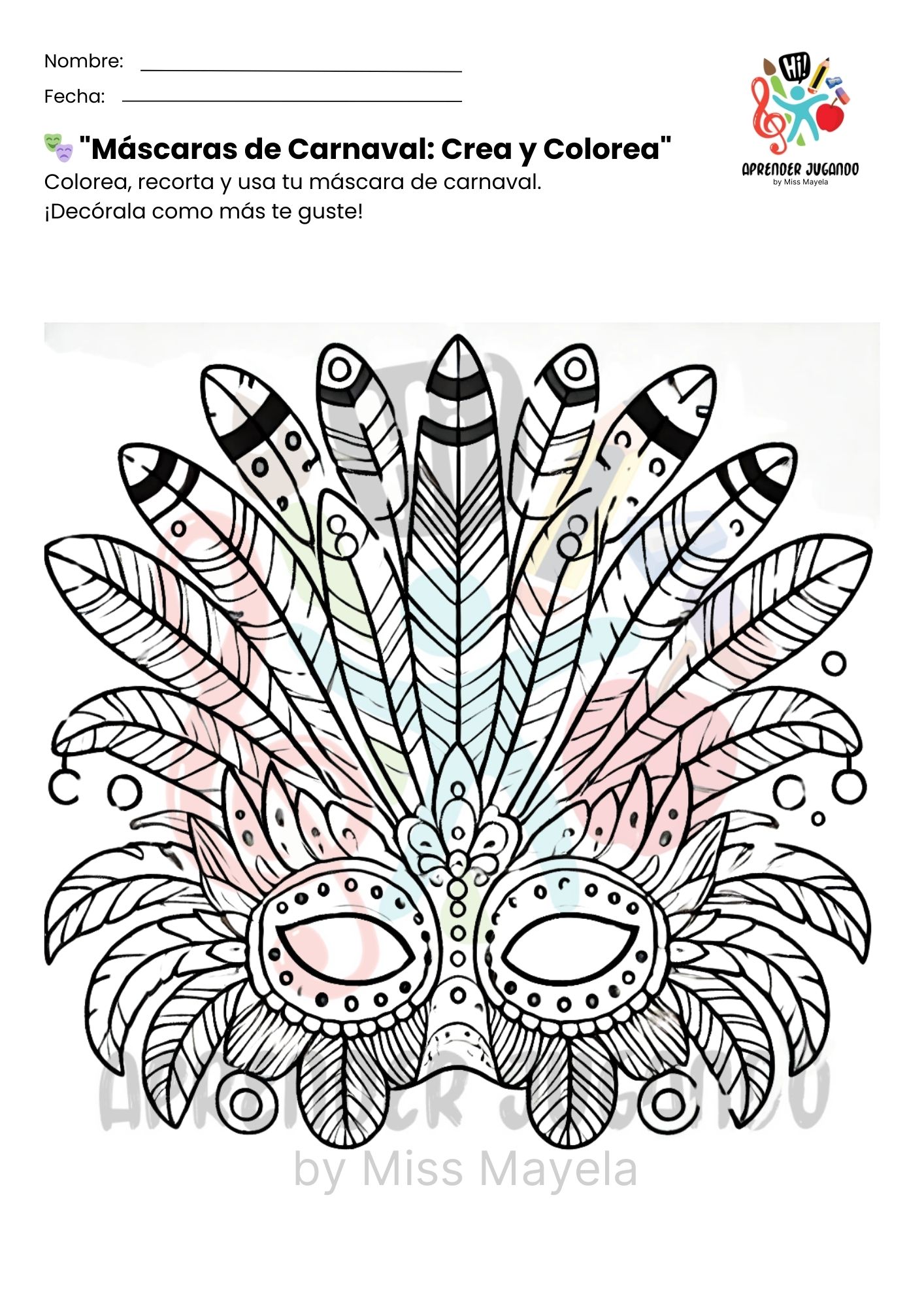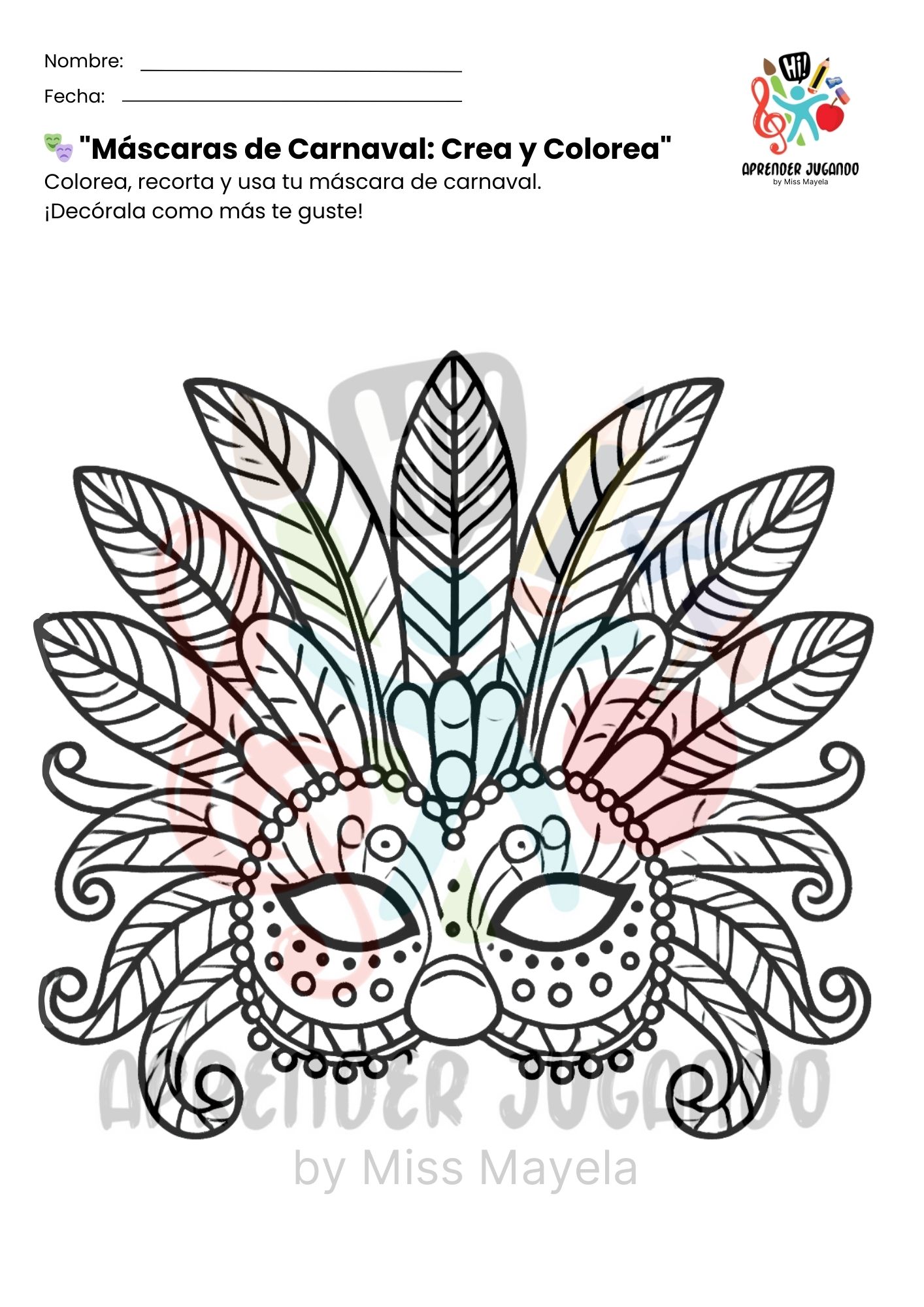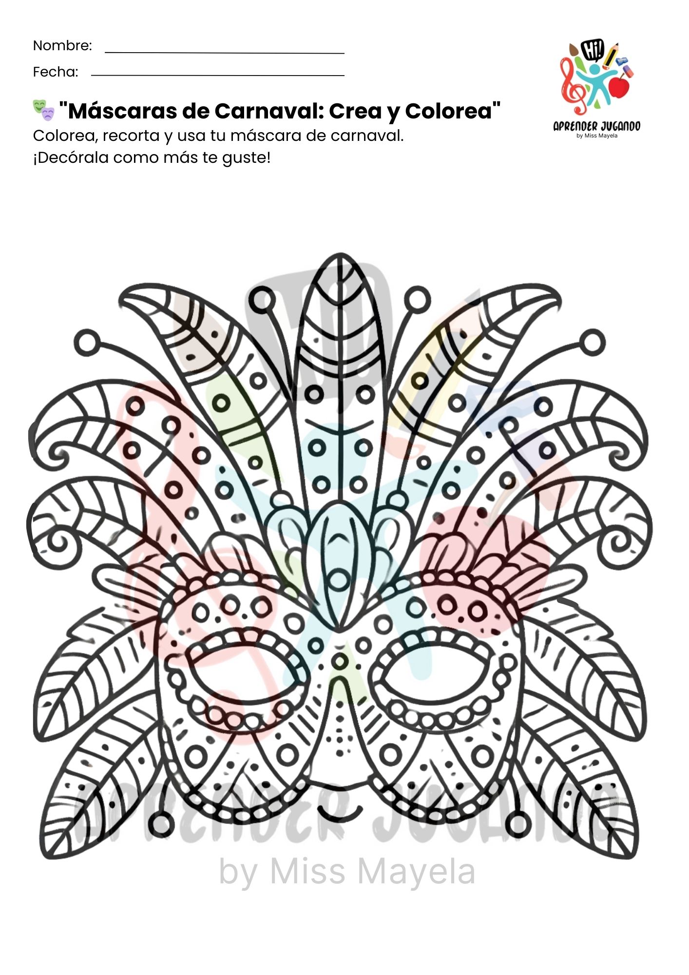 Este recurso educativo gratuito incluye cinco diseños de máscaras listas para colorear y decorar, permitiendo que los niños exploren el arte, desarrollen su motricidad fina y se sumerjan en la magia del carnaval.
