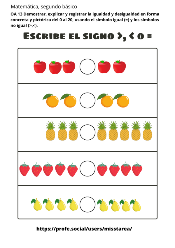 OA 13 Demostrar, explicar y registrar la igualdad y desigualdad en forma concreta y pictórica del 0 al 20, usando el símbolo igual (=) y los símbolos no igual (>,<).