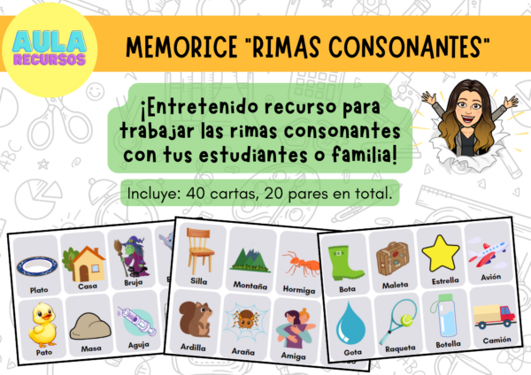 ENTRETENIDO JUEGO MEMORICE DIDÁCTICO PARA REFORZAR EL APRENDIZAJE DE RIMAS CONSONANTE.
