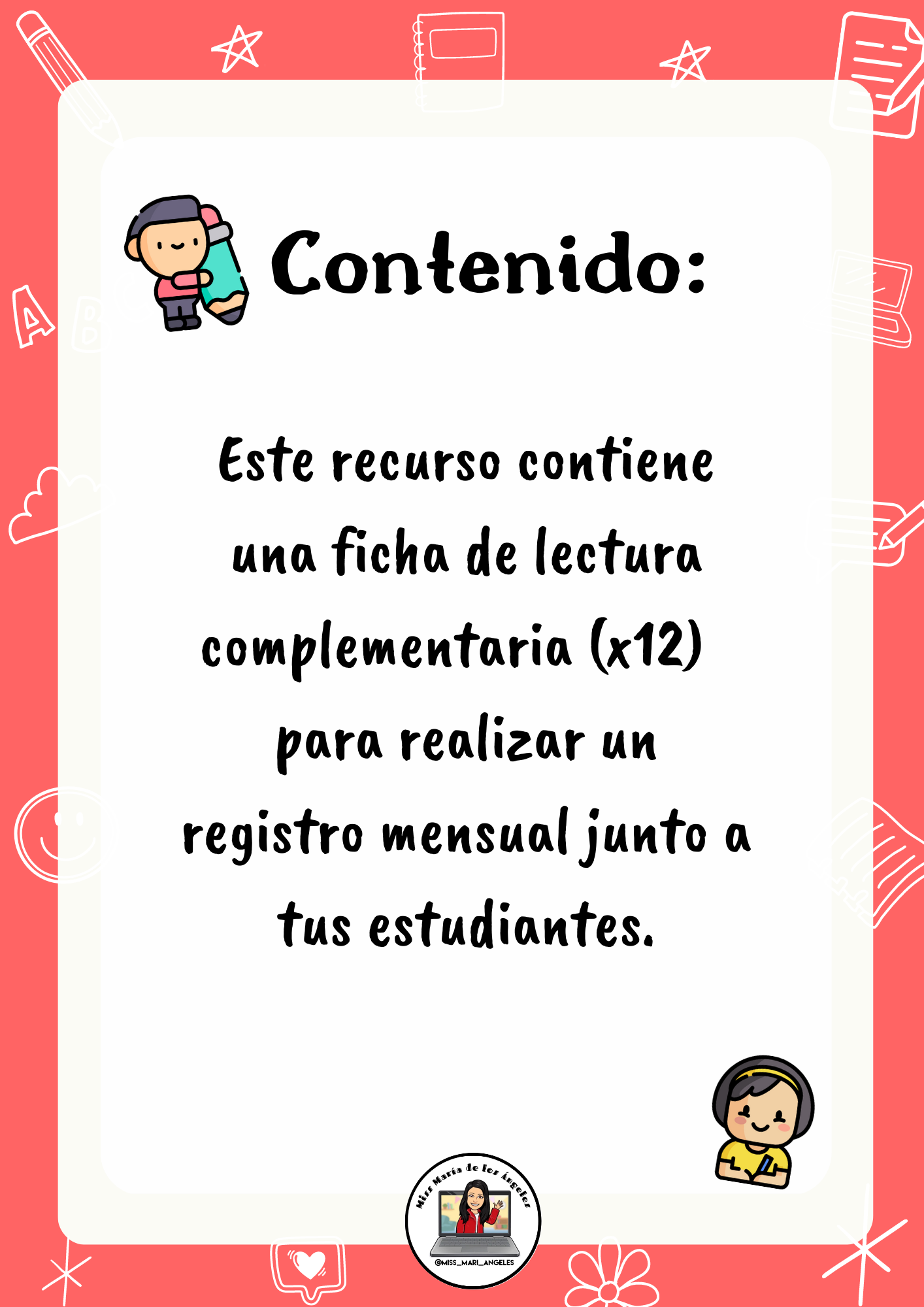 • Este recurso contiene una ficha de lectura complementaria (x12) para realizar un registro mensual junto a tus estudiantes.