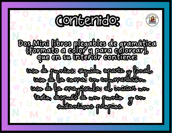 En este recurso encontrarás 2 mini libros en formatos a color y blanco & negro para que tus estudiantes puedan repasar elementos principales de la ortografía tales como: uso de puntos: seguido, aparte y final, uso de la coma: en enumeración, uso de la mayúscula: al iniciar un texto, después de un punto y en sustantivos propios.