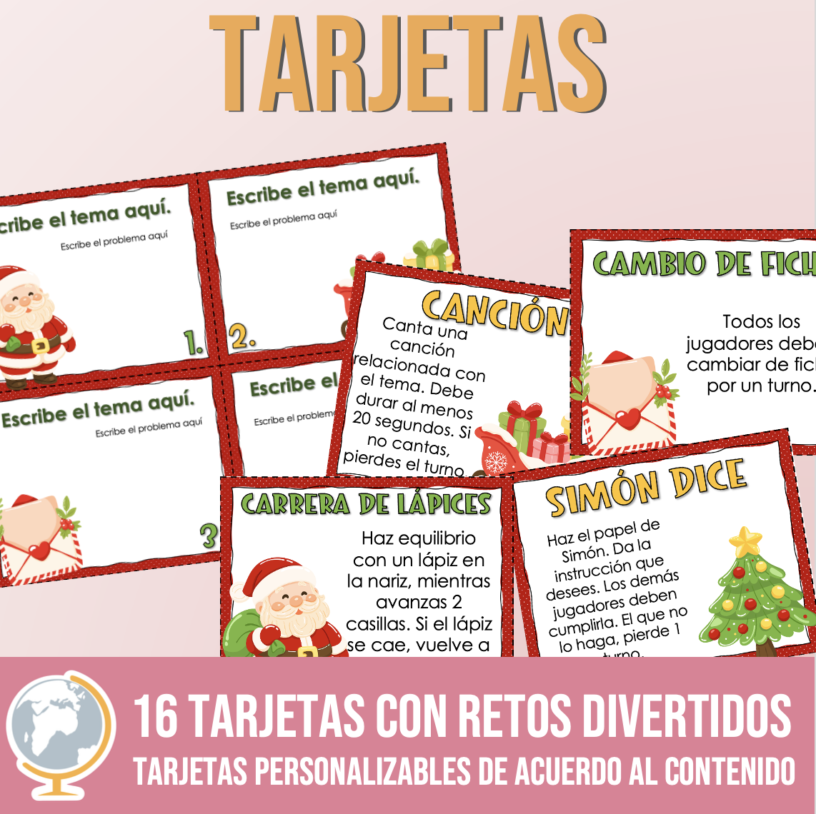 Este recurso está diseñado para hacer de tus clases una experiencia dinámica y memorable durante la temporada navideña. Contiene todo lo necesario para promover el aprendizaje a través del juego: dos tableros con diseños navideños, tarjetas de reto y tarjetas personalizables para que puedas adaptar las preguntas o actividades a tus propios contenidos. Es perfecto para repasar, evaluar de manera informal o simplemente disfrutar de una clase divertida sin perder el propósito académico.