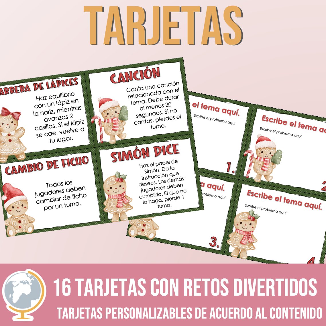 Este recurso está diseñado para hacer de tus clases una experiencia dinámica y memorable durante la temporada navideña. Contiene todo lo necesario para promover el aprendizaje a través del juego: dos tableros con diseños navideños, tarjetas de reto y tarjetas personalizables para que puedas adaptar las preguntas o actividades a tus propios contenidos. Es perfecto para repasar, evaluar de manera informal o simplemente disfrutar de una clase divertida sin perder el propósito académico.