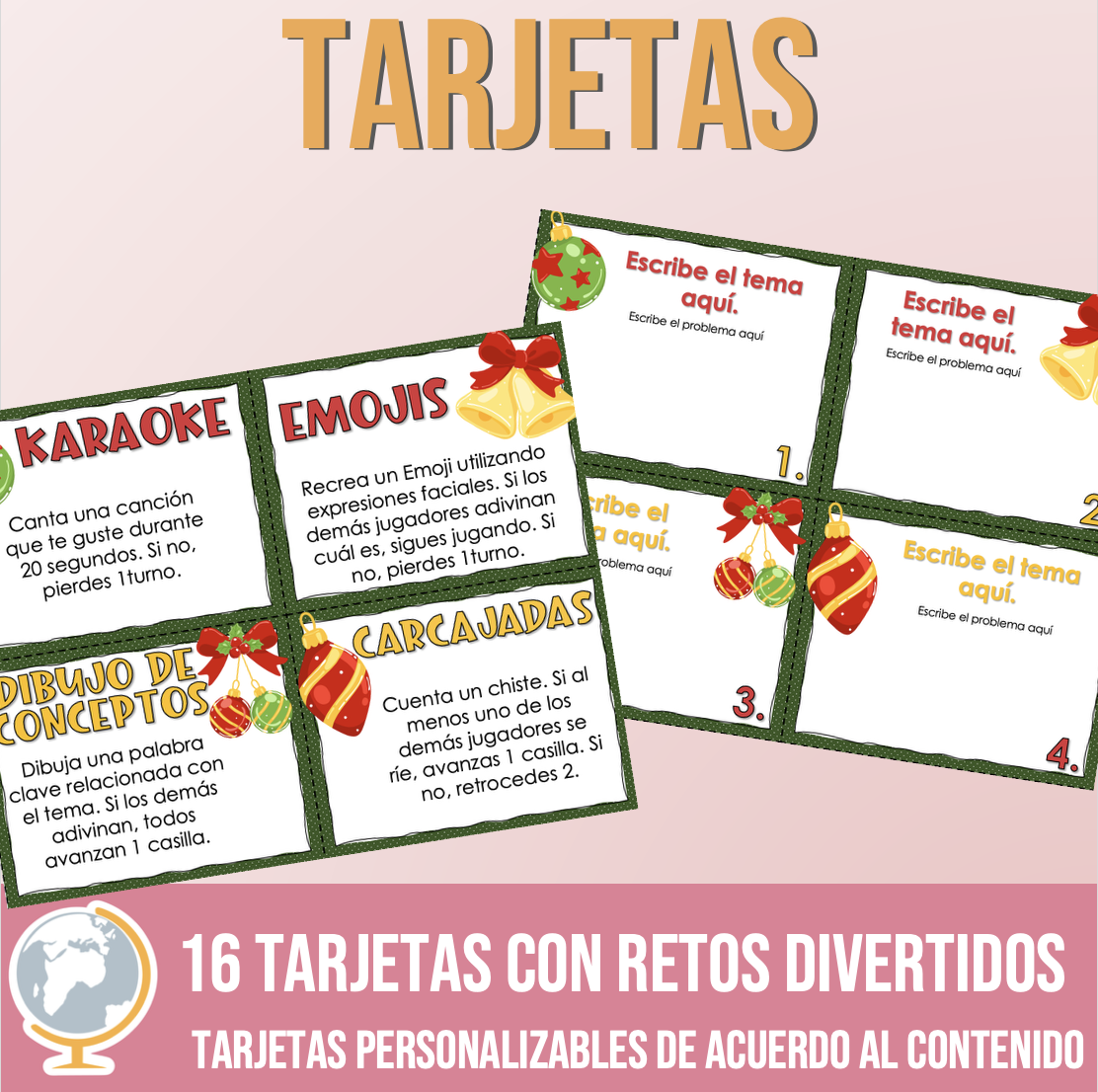 Este recurso está diseñado para hacer de tus clases una experiencia dinámica y memorable durante la temporada navideña. Contiene todo lo necesario para promover el aprendizaje a través del juego: dos tableros con diseños navideños, tarjetas de reto y tarjetas personalizables para que puedas adaptar las preguntas o actividades a tus propios contenidos. Es perfecto para repasar, evaluar de manera informal o simplemente disfrutar de una clase divertida sin perder el propósito académico.
