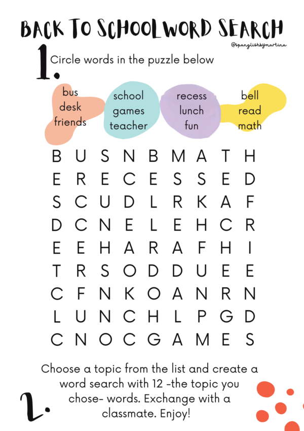 Realizan la sopa de letras – para todos los niveles – y luego en página 2 hacemos un brainstorming de ideas sobre posibles temas para futuras sopas de letras. Una vez que esta lista esté completa con las ideas que traen nuestros estudiantes recortamos y en pares o pequeños grupitos de trabajo sacan un papelito. Con ese tema, ese par/grupo debe armar una sopa de letras que luego intercambiará con otro grupo y resolverá.